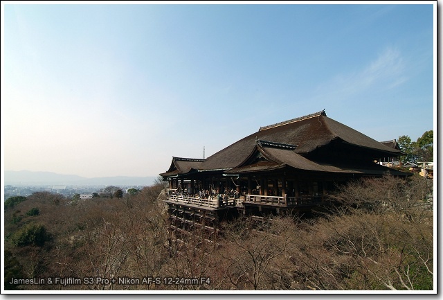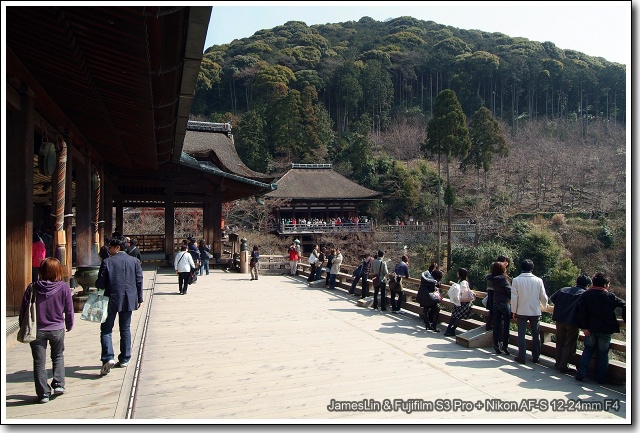 這個角度剛剛好可以把清水寺完整入鏡!而且可以看到很多人踏著的那個木製平台的結構...