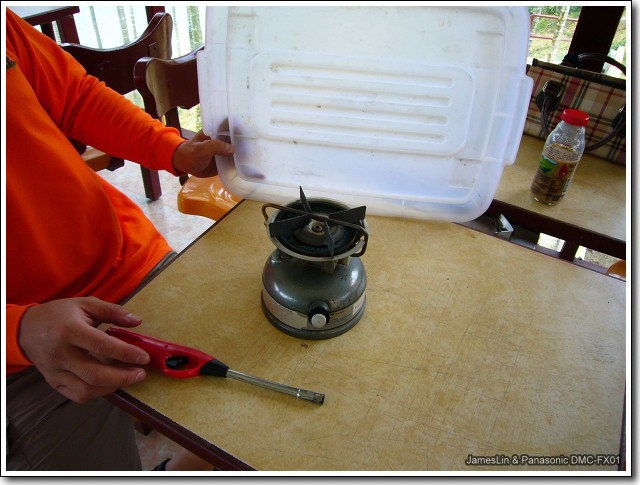 我們的午餐菜單有:桶仔雞與韓式泡菜火鍋,所以杜立德將汽化爐拿出來~給他發爐一下...