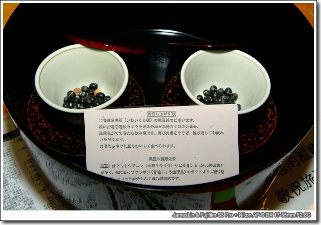 十勝這個地方是北海道有名的豆子產地,主要盛產...豆,豆,豆,通通都是豆就對了,所以房間內附的這個黑豆茶也是這裡的特產,聽導遊小雷說喝之前要先沖泡熱水十分鐘,然後這黑豆的皮會自然脫落,那個時候就可以品嚐了...