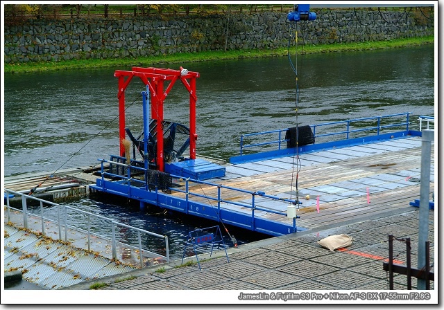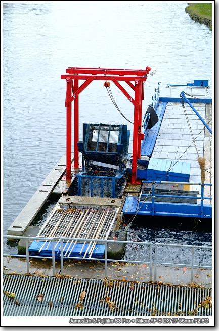 仔細看水車有水花潑出來,那就是有鮭魚被補上來了,現場觀看可以很清楚地聽到鮭魚「啪噠啪達」的拍打聲!