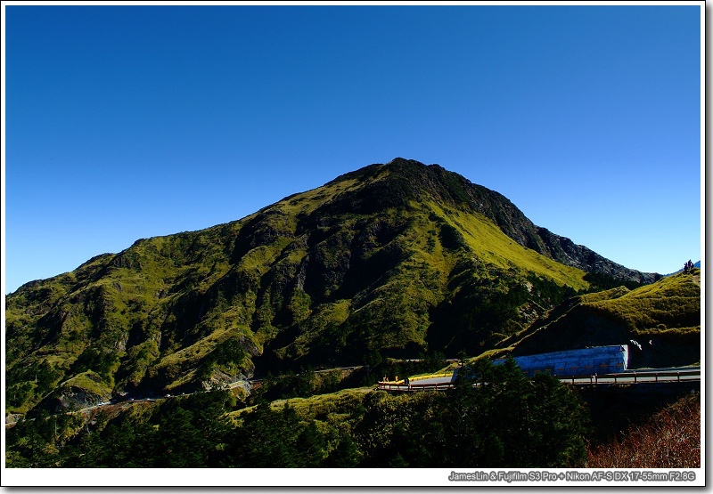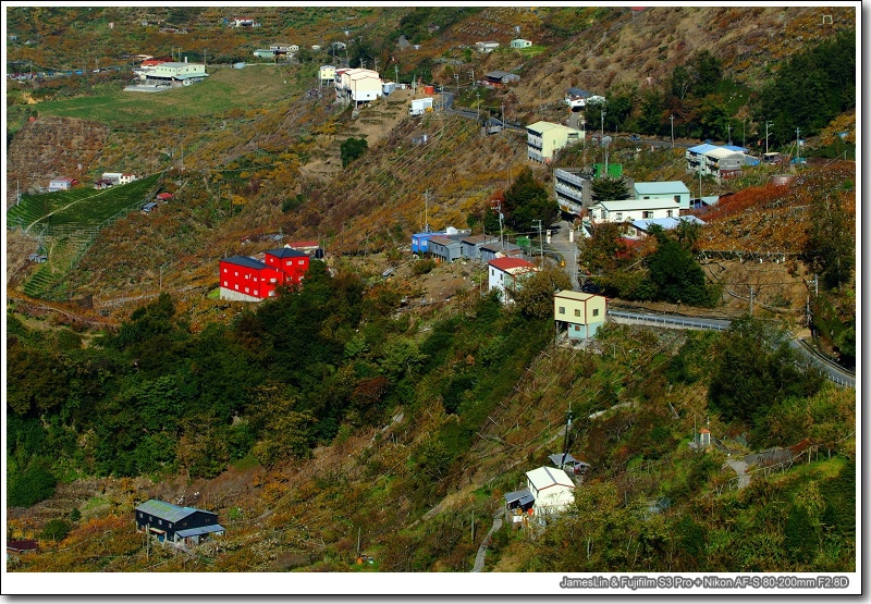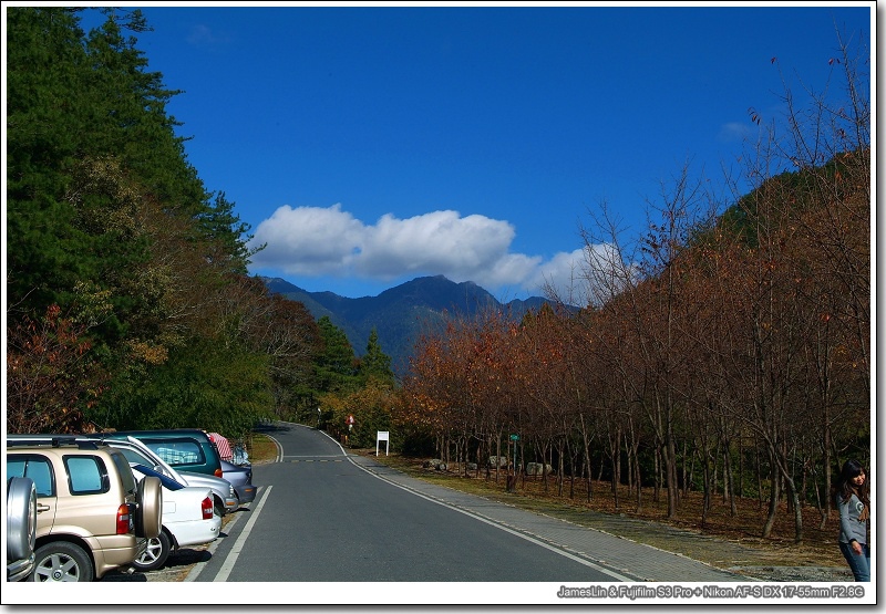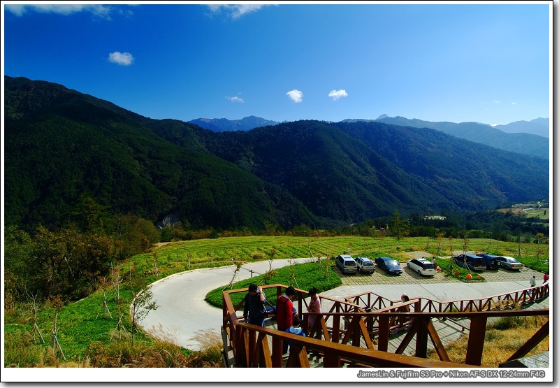 #13 武陵茶莊買茶出來(試喝過後,我買了半生熟的武陵金萱茶,一斤2000,還送一盒茶包),看見遠方的桃山美景,趕緊拍一張,這張照片可以看到我們這一行三台車的身影,最靠近照片只剩下一個銀色備胎蓋那台是小彬的三吋GV,金色那台是卡爾的原廠GV,再過去幾台露出銀色車頭與呼吸管的就是我的四吋XL-7啦~呵呵!