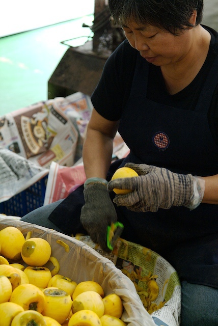 一樓工廠內有兩位...ㄟ~柿餅阿姨吧,正在替柿子去皮...
