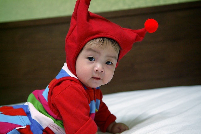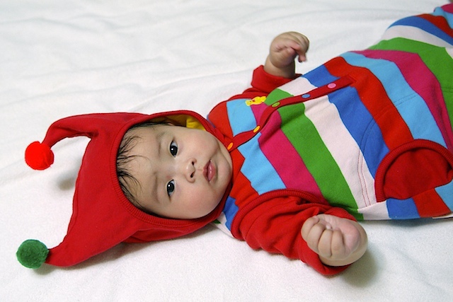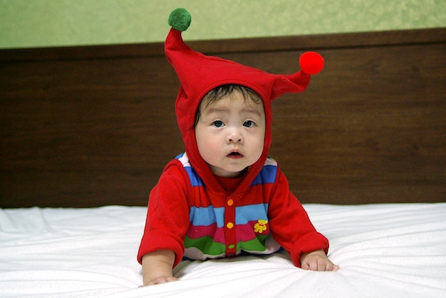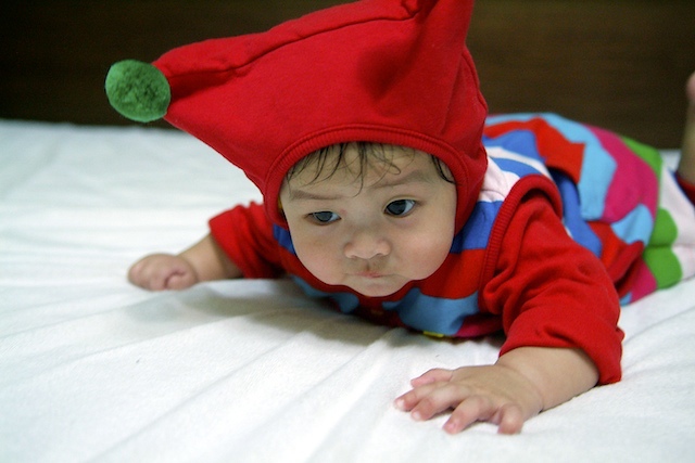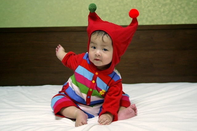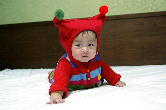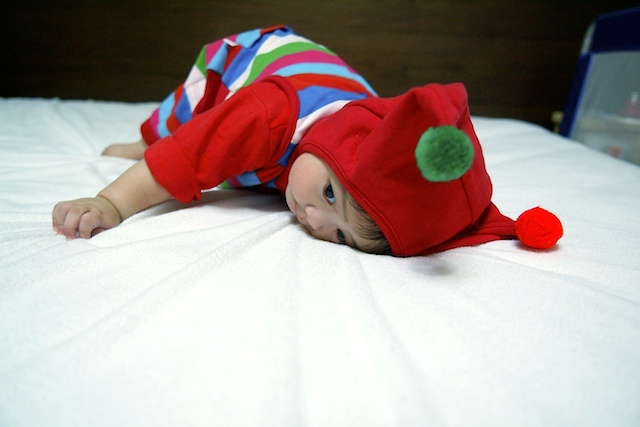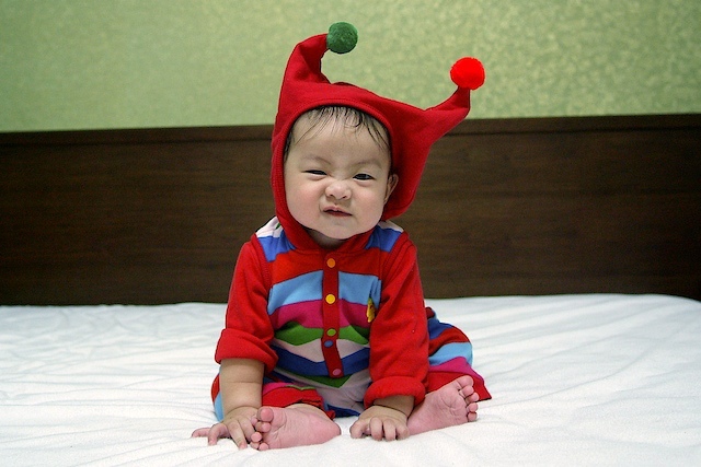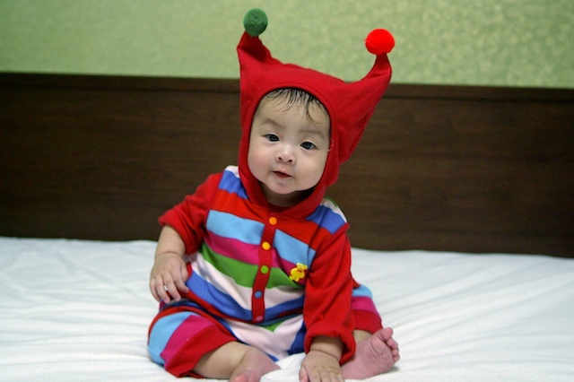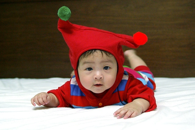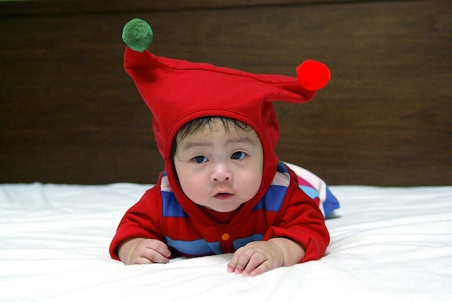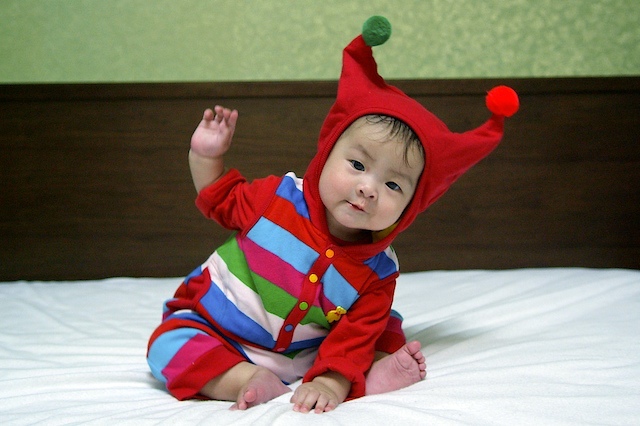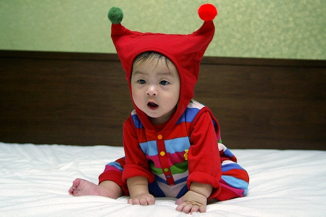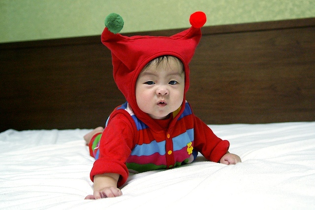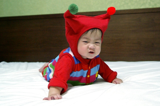 可是一回到家彷彿脫韁野馬,好像被綁了很久突然解放了一樣,High個沒完,所以這次我們趁著她的小精靈裝還沒脫下來,把小辰辰放在大床上,讓她好好抒發一下,順便用單眼記錄她各式各樣的超Q表情...來個16連拍吧!