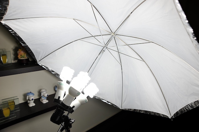棚燈採用的是透射反射三用傘 + 一轉四E27燈座 + 全光譜省電燈泡,其中所謂的三用傘可以視攝影需求變成白色透射傘、白色反射傘、銀色反射傘這三種,所以號稱三用傘。