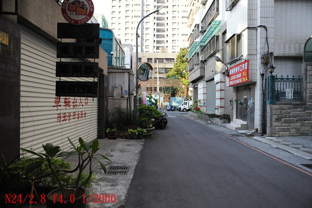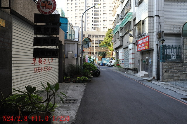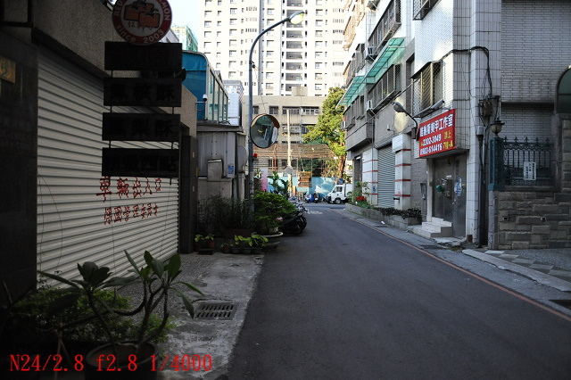測試地點就在紅柿子烘焙坊外頭,腳架一站,機器放上去,依序將每組光圈、快門拍過一次,然後取畫面的中央與邊緣部分來做100%放大檢視。