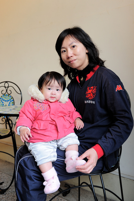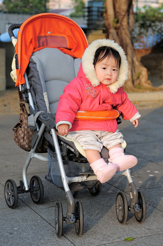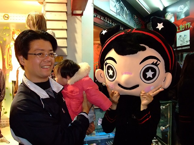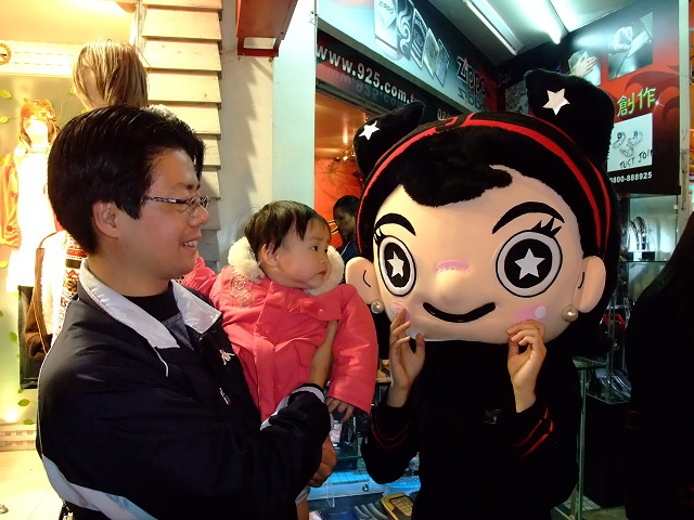 剛好有一家服飾店(大概吧...)的店員扮一個大頭娃娃出來宣傳,就把林家女孩抱過去拍照,沒想到林家女孩會害怕ㄟ!