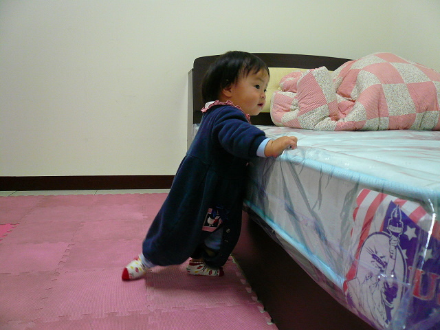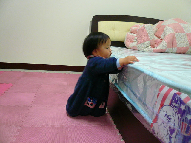 林家女孩終於可以漸漸地控制自己的肌肉與膝蓋關節,讓身體慢慢下降,然後用「跪」的姿勢坐下,也可以聽從大人的指示做出這一個動作,不過目前還是要看「心情」啦,呵呵~