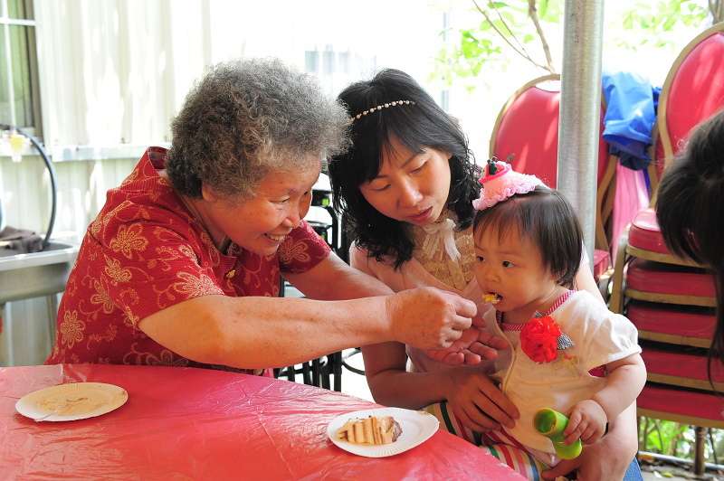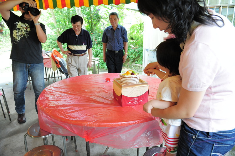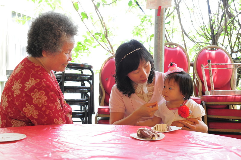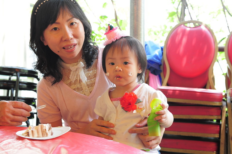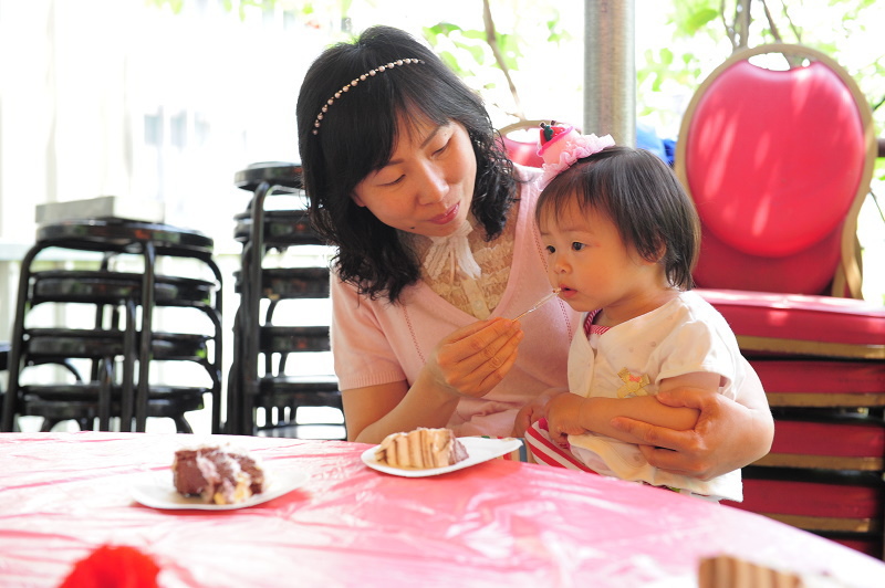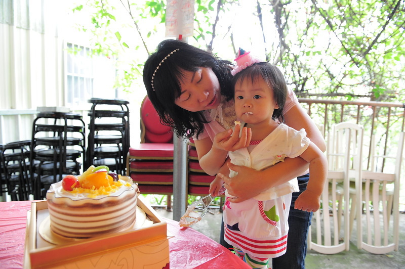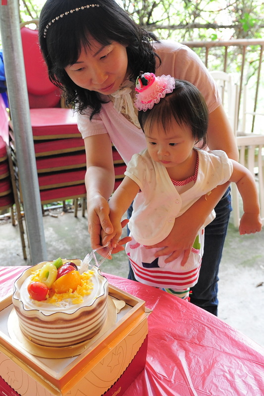 園長幫林家女孩塗奶油,恭喜她一歲了!