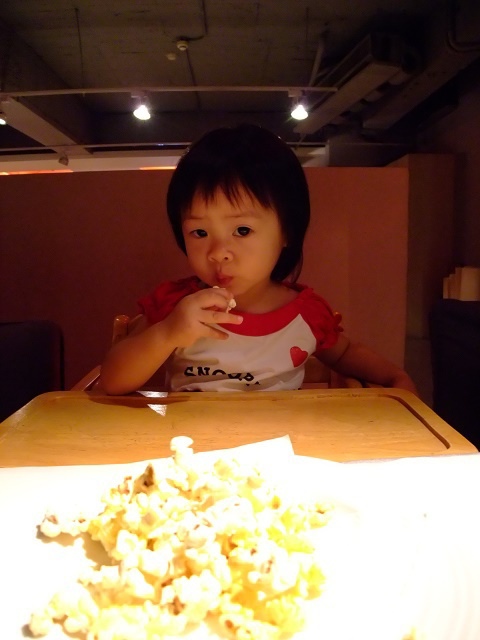 西堤牛排一看到有小朋友,就會招待一盤甜的爆米花,這一盤幾乎都被林家女孩一個人解決掉...