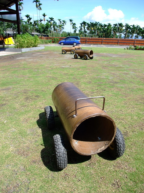 草地上的紙捲車小朋友們可以玩,這是用紙捲做成的...