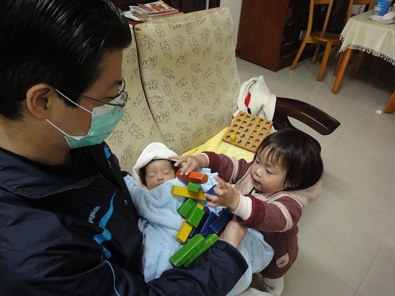 姊姊第一次看到妹妹有點不知所措,害羞地不敢靠近,但慢慢地在好奇心的驅使下開始靠近我家園長手上抱著的妹妹...