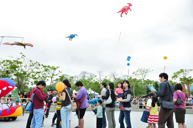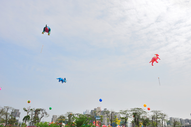 其實在往文心公園的路上,遠遠地就可以看到飛在天空的恐龍,林家姊姊一直指著車窗外好奇地張望...