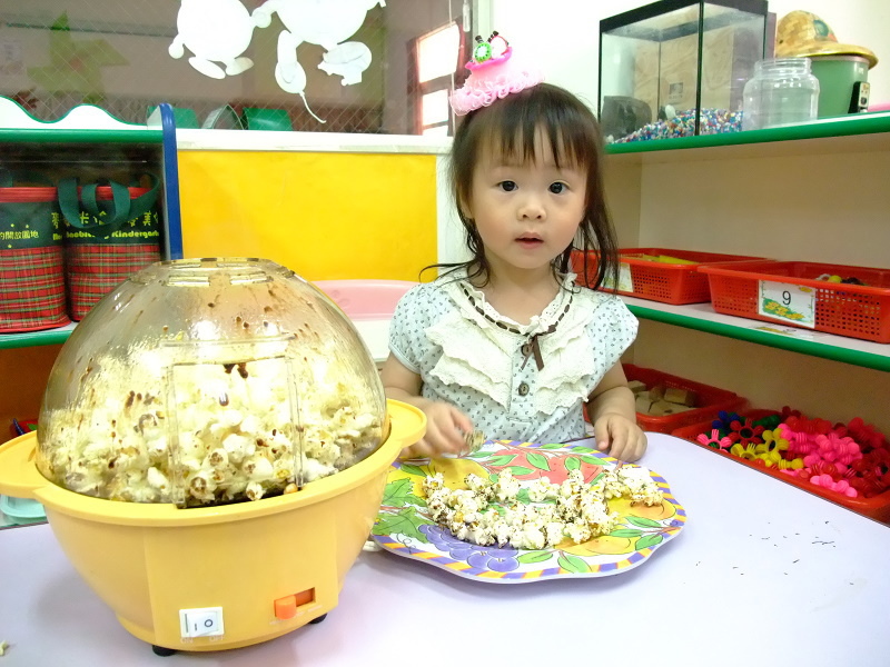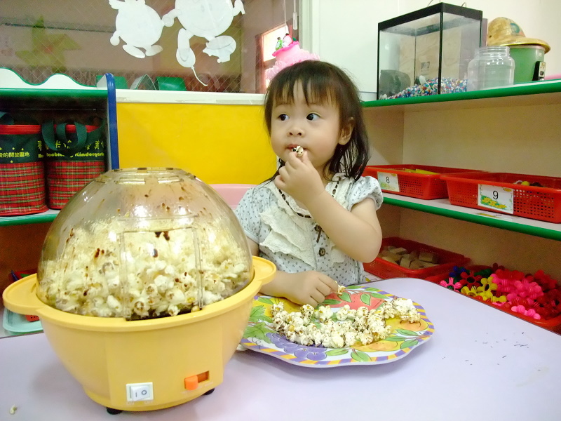 林家姊姊滿二歲了! 今天特別打扮了一番,還戴著我家園長手工製作的「蛋糕頭飾」到學校爆米花分享給全部同學! 巧克力口味的爆米花,好香喔~~~