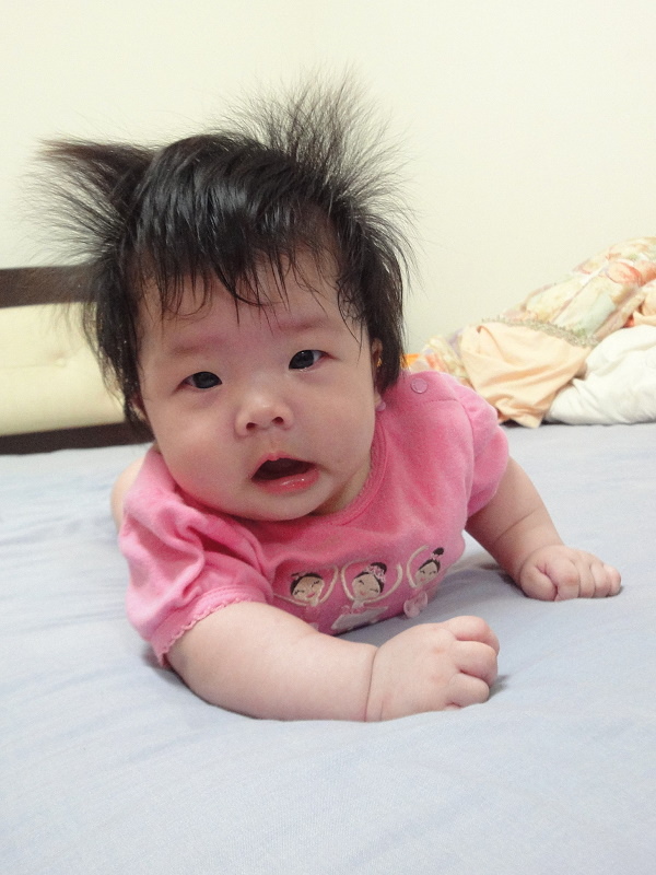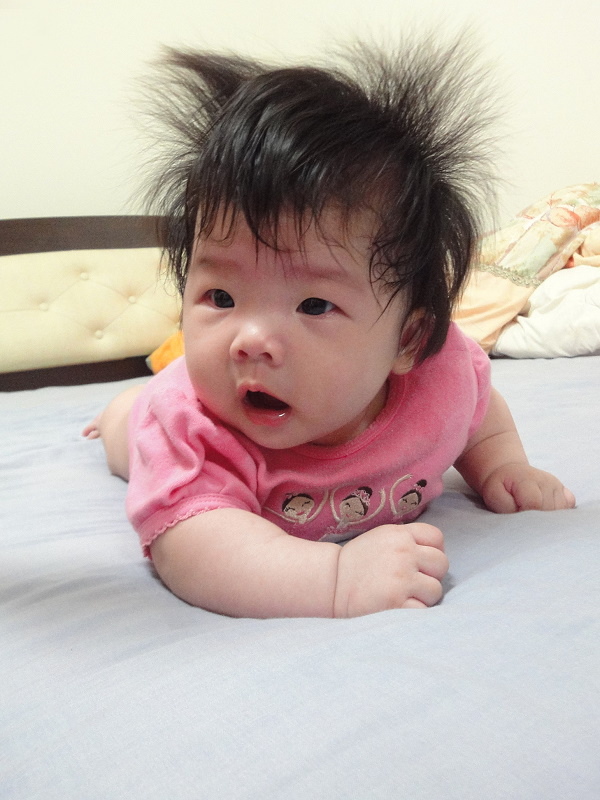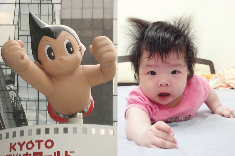 林家妹妹遺傳到爸爸(就是我),髮色黑,髮絲粗,老是東翹一塊、西翹一撮,看上去好像......「原子小金剛」!對!就是「原子小金剛」!