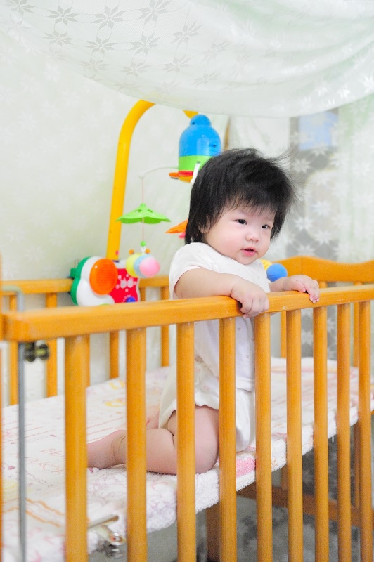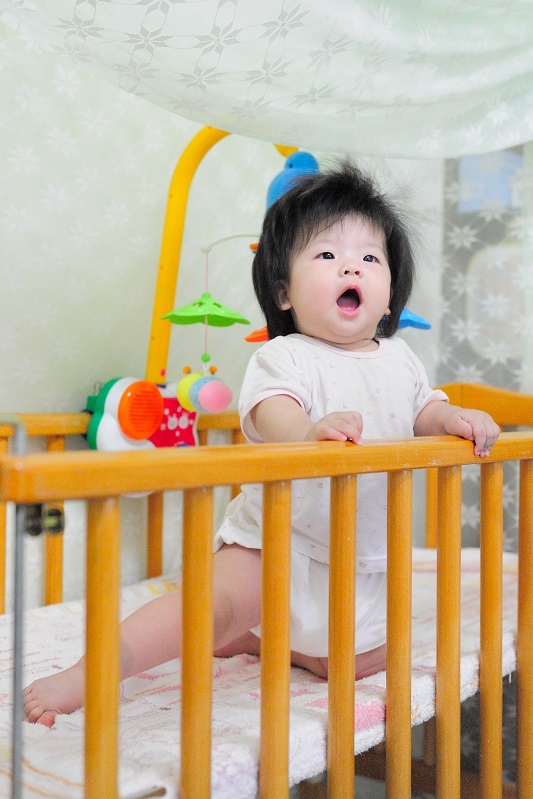 這天晚上跟妹妹玩的時候又發現妹妹已經會抓小床邊的欄杆,整個人跪立起來!