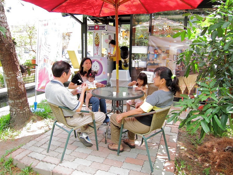 #12 天氣很熱,我們坐在樹蔭下吃冰淇淋,這裡的冰淇淋很有特點,一人份就是一小小桶冰淇淋然後用機器去擠壓出來的,完全不沾手,很衛生!