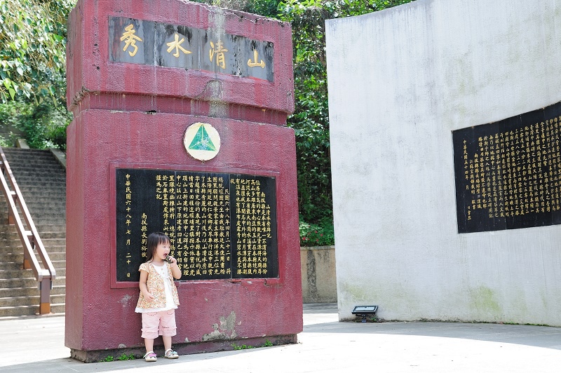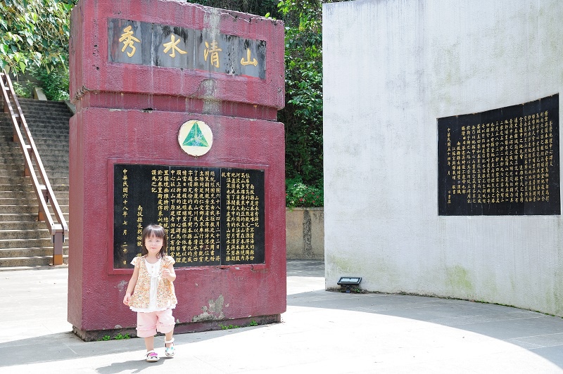 「地理中心碑」又稱「山清水秀碑」,上有一根不鏽鋼長柱,下有先總統蔣經國先生所題「山清水秀」四字,並有前南投縣長楊昭壁先生的「台灣地理中心碑」碑文及前南投縣劉裕猷先生的「山清水秀」碑文,兩篇碑文分別敘述了這一地理中心碑的地理位置、建碑沿起,以及此地「地據中心而盡挹蓬贏清芬萃之於斯」的人文勝概。