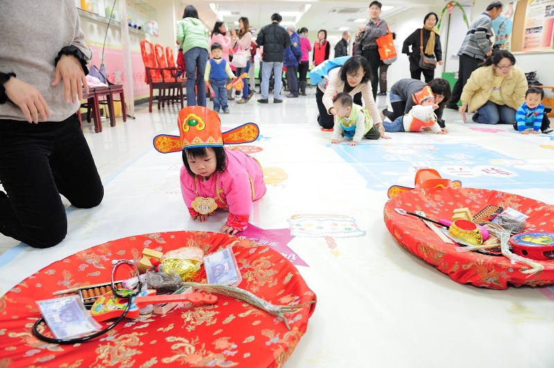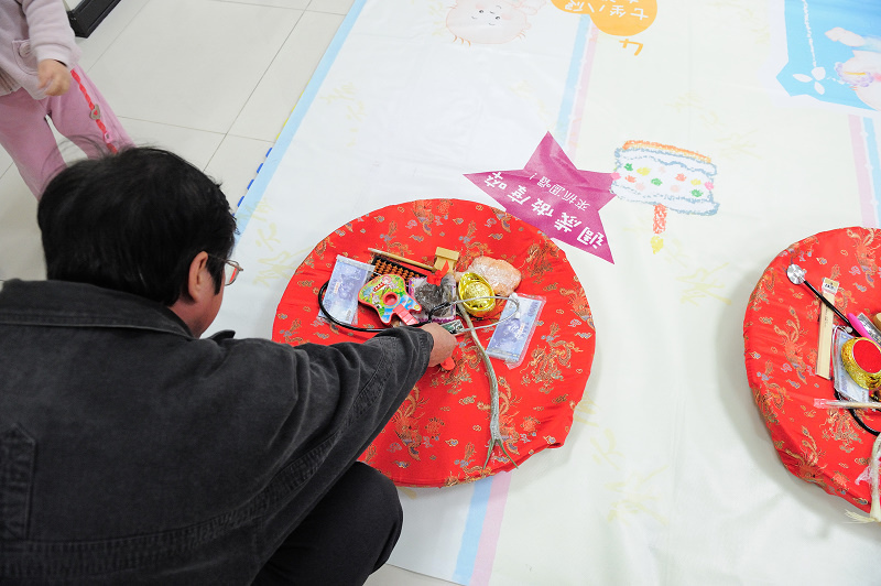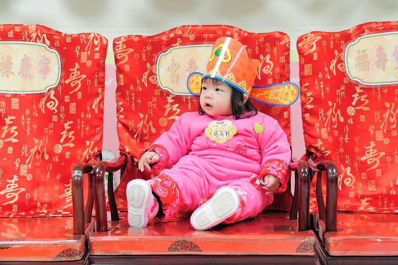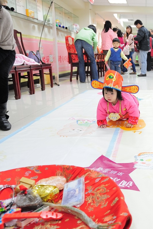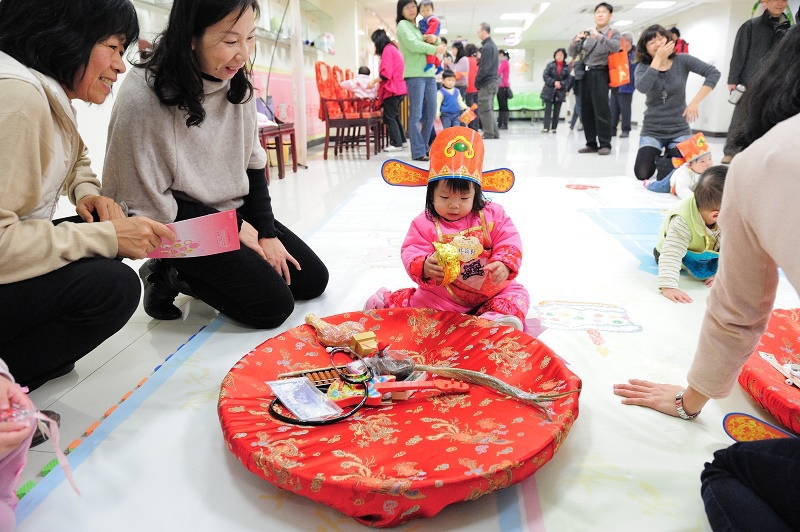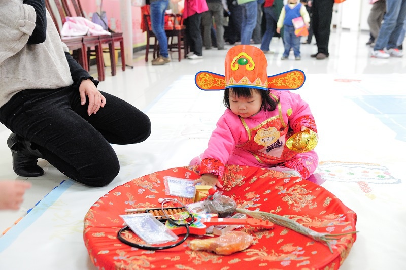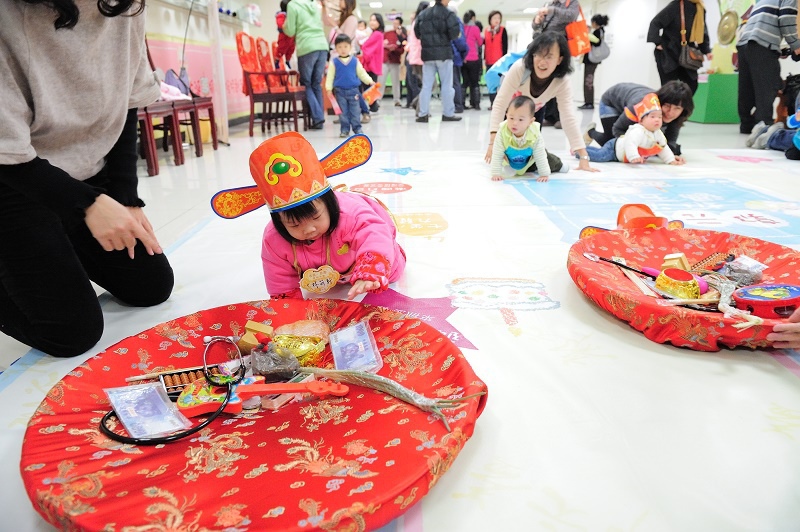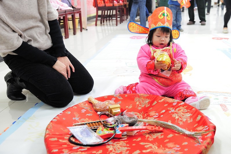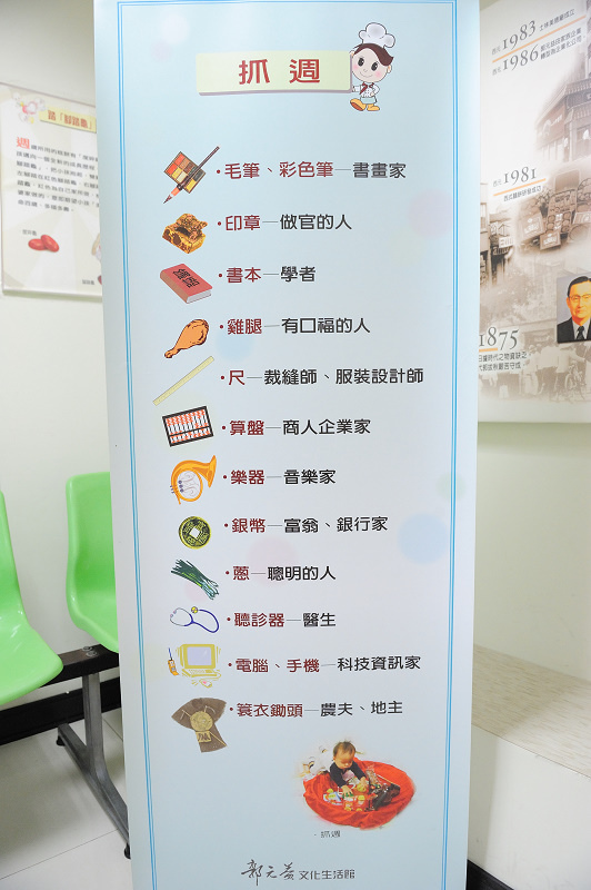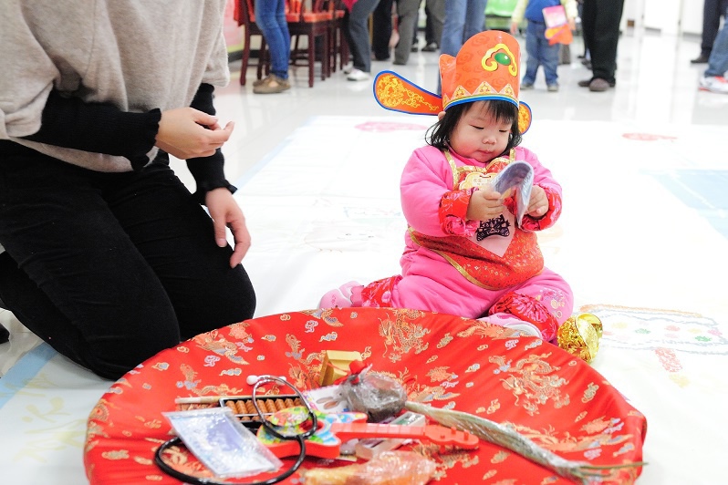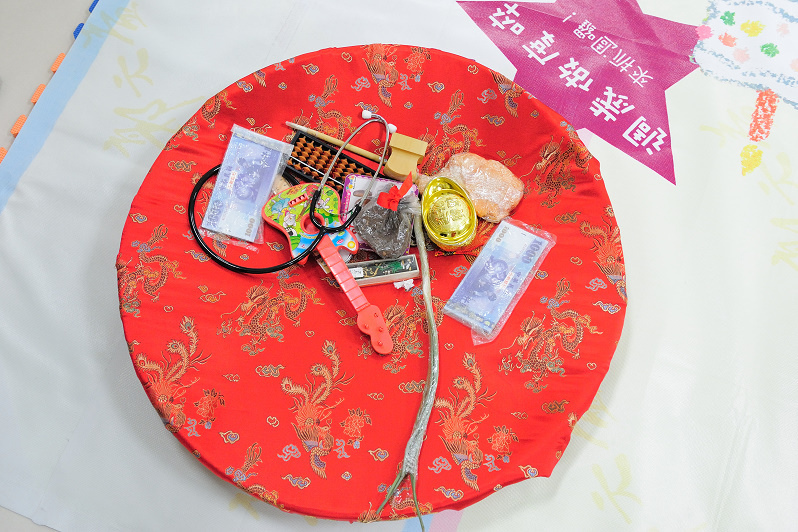 #14 抓周(在米篩中,放入12~14樣物品,諸如書、印章、筆墨、算盤(計算機)、錢幣、雞腿、尺、蔥、芹菜、蒜、簑衣、稻草、聽筒...等,讓滿週歲的孩子任意抓取,已預卜孩子將來的志願及事業)