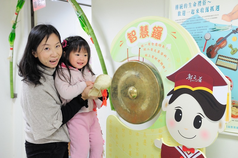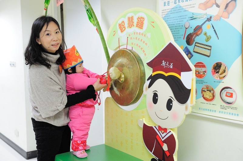 妹妹膽子很大,麻麻握著妹妹的小手一起敲, 鑼聲響亮,妹妹一點都沒被嚇到,反倒是姊姊敲鑼時嚇到哭XD~