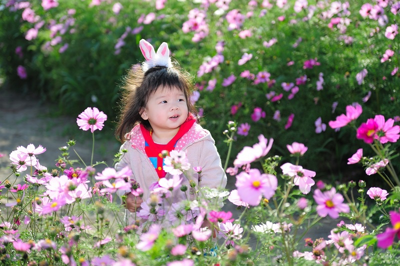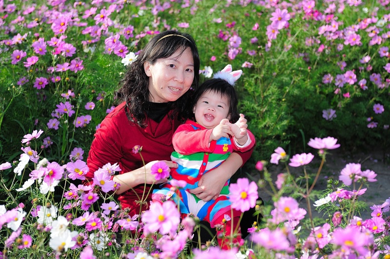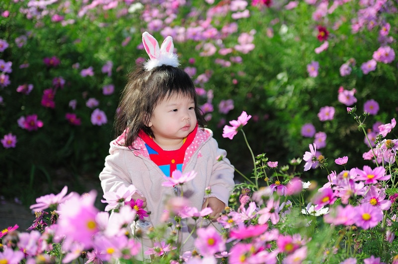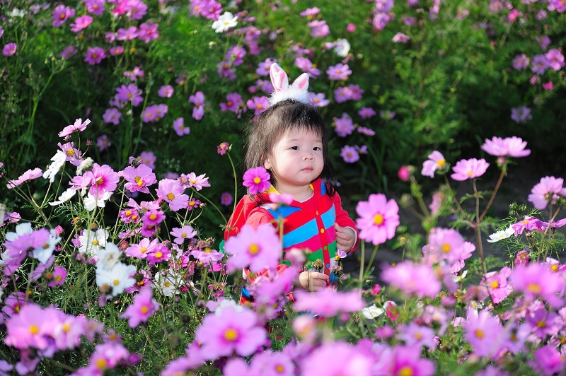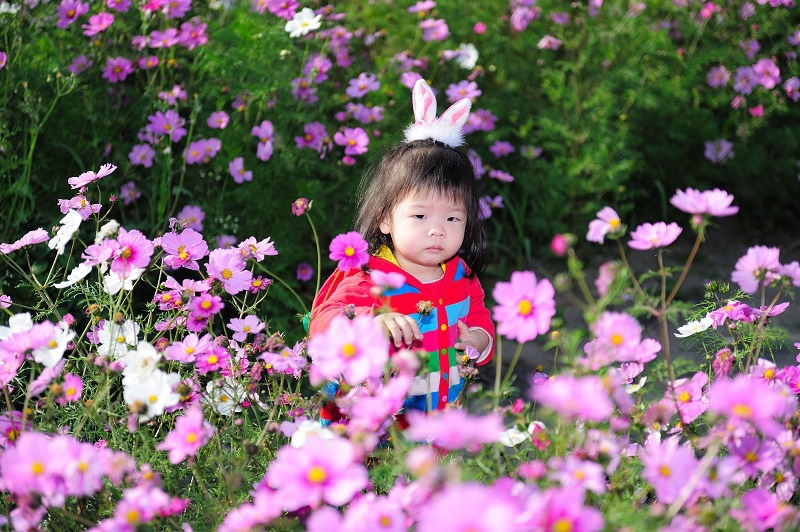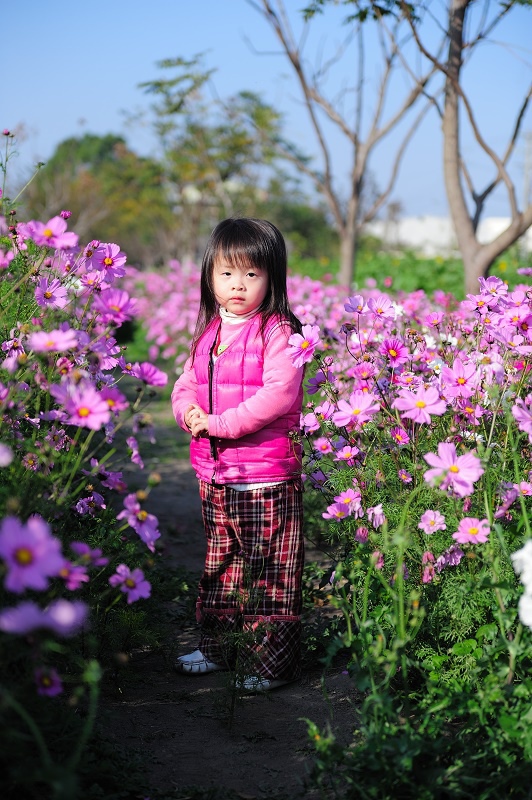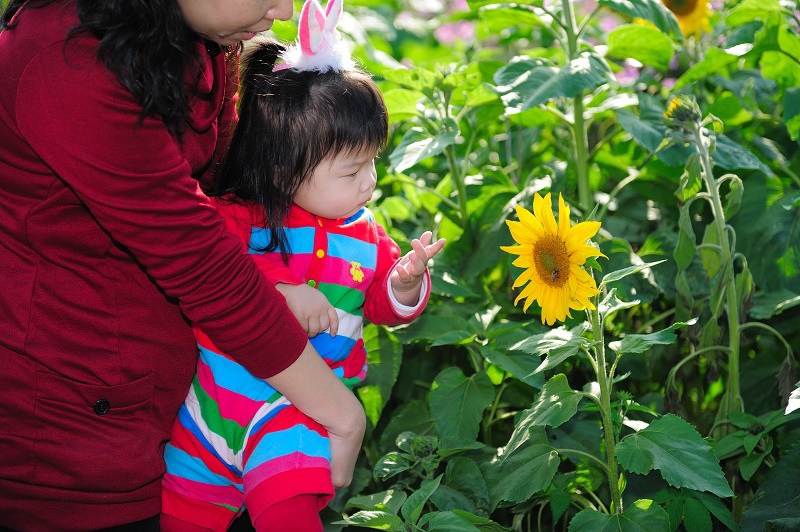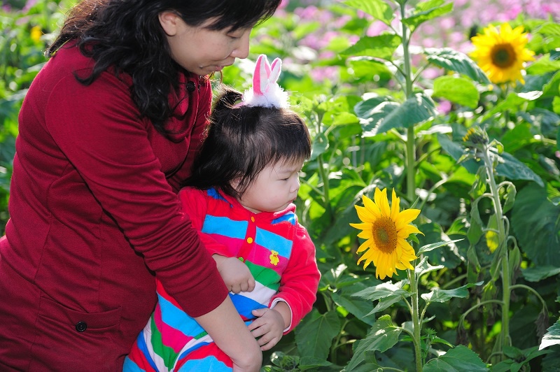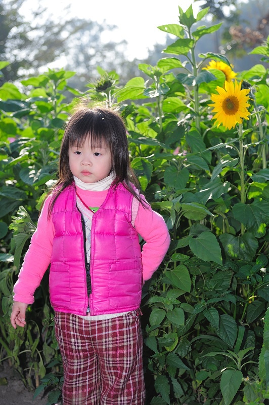 #22 林家姊姊正蹲在地上玩沙子,被叫來與向日葵拍照,她一臉不高興,呵呵~