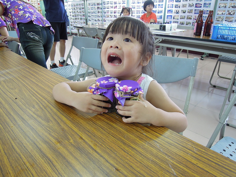 #38 妹妹一直以為蜜餞可以當場吃,所以她看見瓶子被封起來的時候很生氣,氣到把其中一個罐子給打翻在地上,還好這玻璃罐很厚實,才沒有摔破......Orz