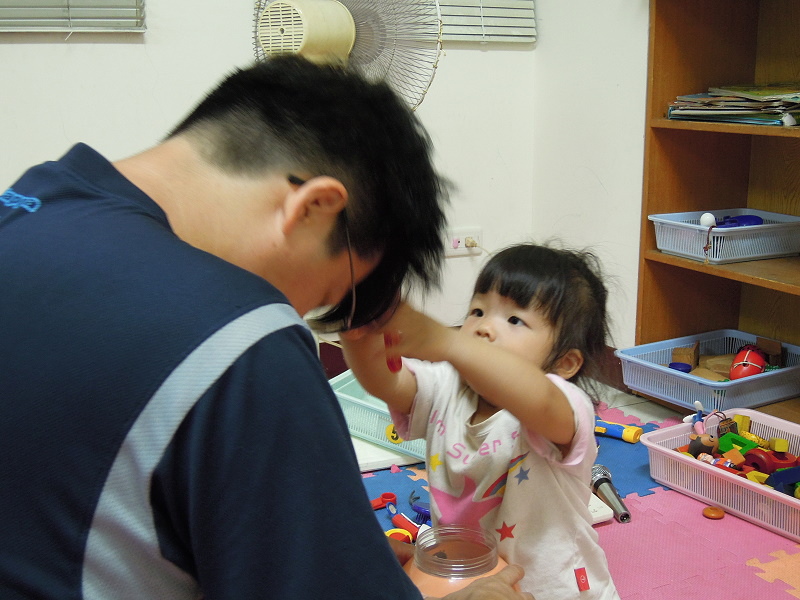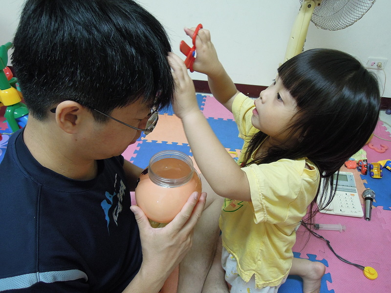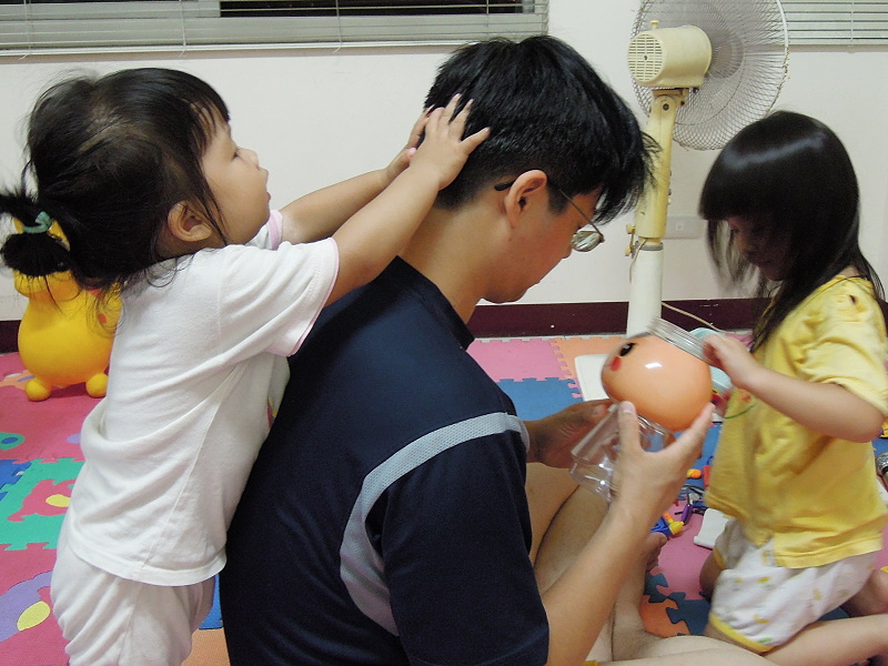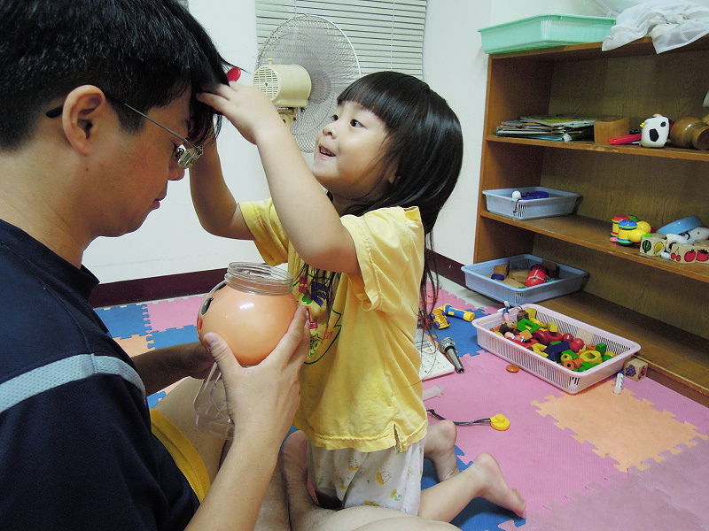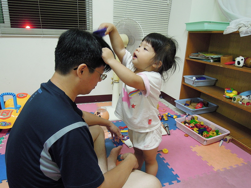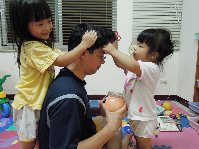 最近兩姊妹也開始會玩剪頭髮的遊戲了,而且步驟模仿自阿嬤和媽媽,一定要我們配合的人自己捧個盆子或桶子,然後眼睛要閉上~