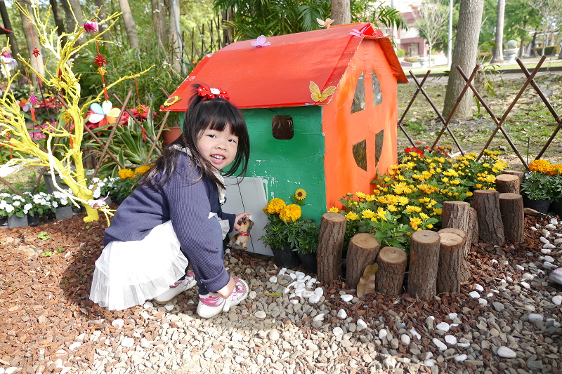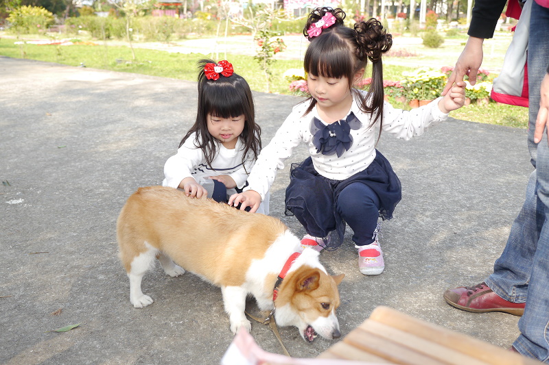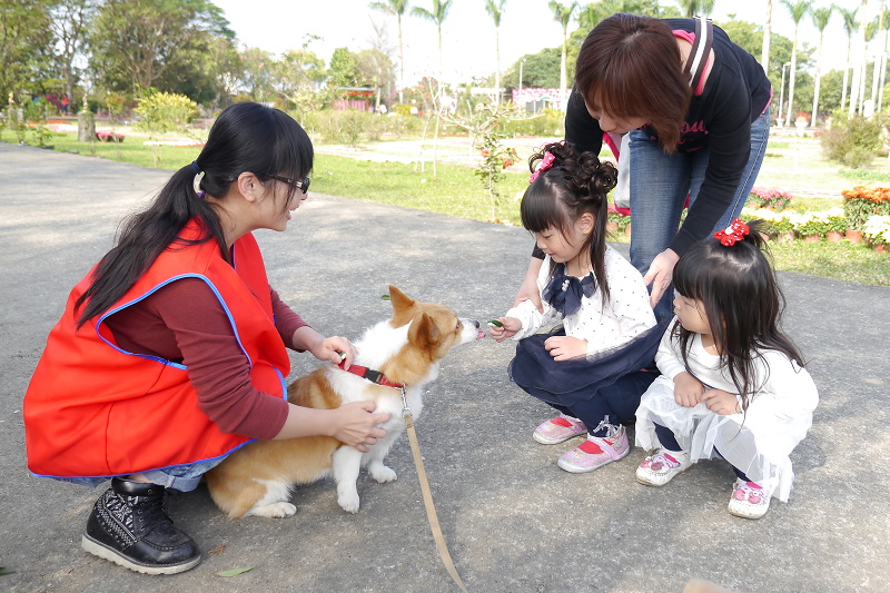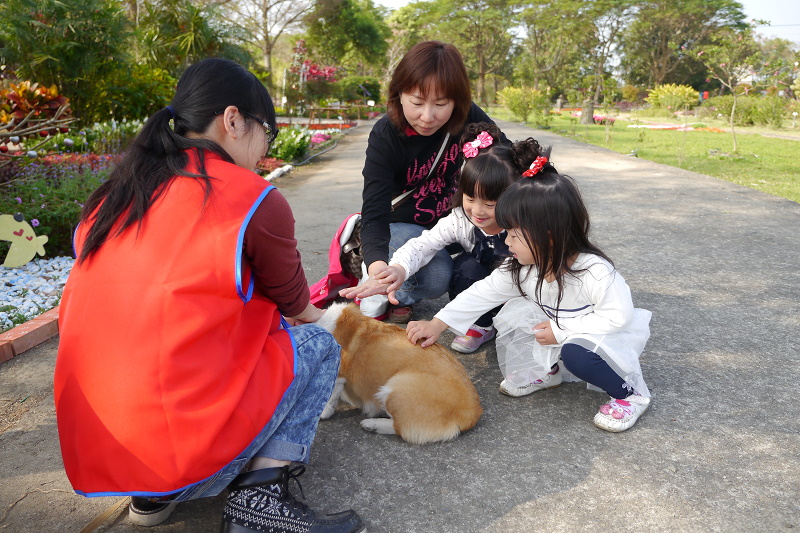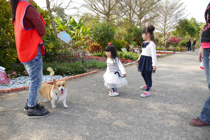 #17 過年期間有穿紅背心的義工人員在園內幫大家做介紹,而這位義工小姐還帶了一隻柯基犬來,小朋友馬上就被狗狗給吸引過去了~