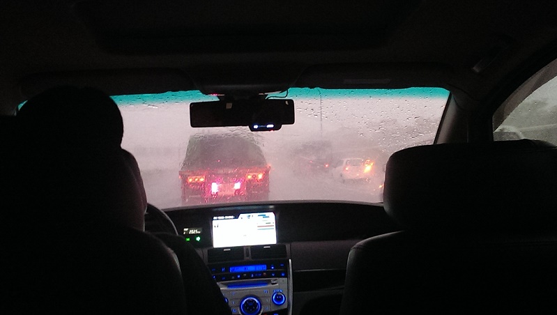 沒想到運氣真是棒!高雄居然下起大雷雨,高速公路上大家都不敢大意,放慢速度龜速前進......