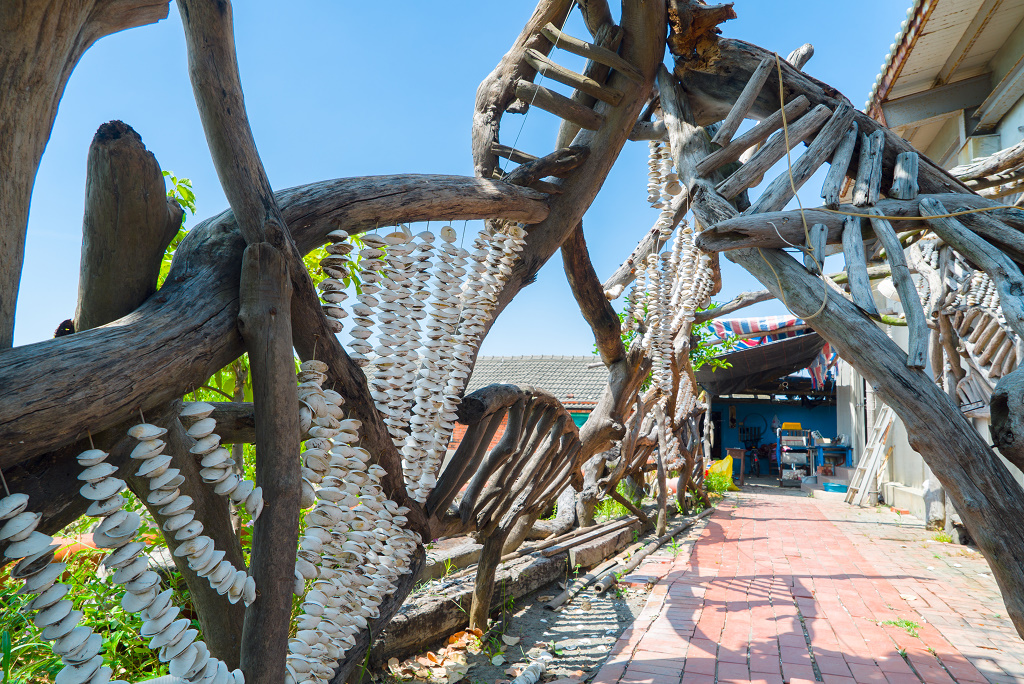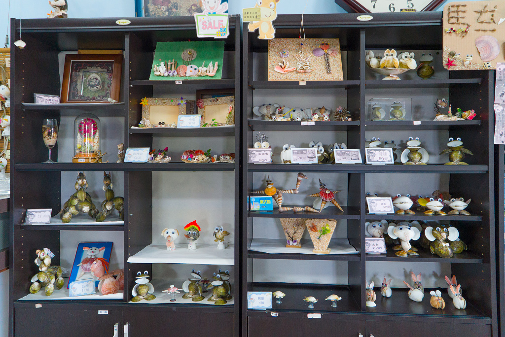 在主題館精心巧思鑽研下,蛤貝被研發製作成各種精巧可愛的動物造型及彩繪藝術品,除了題供中小學手工藝教材之外,也提供漁村體驗中手工藝DIY的樂趣。
