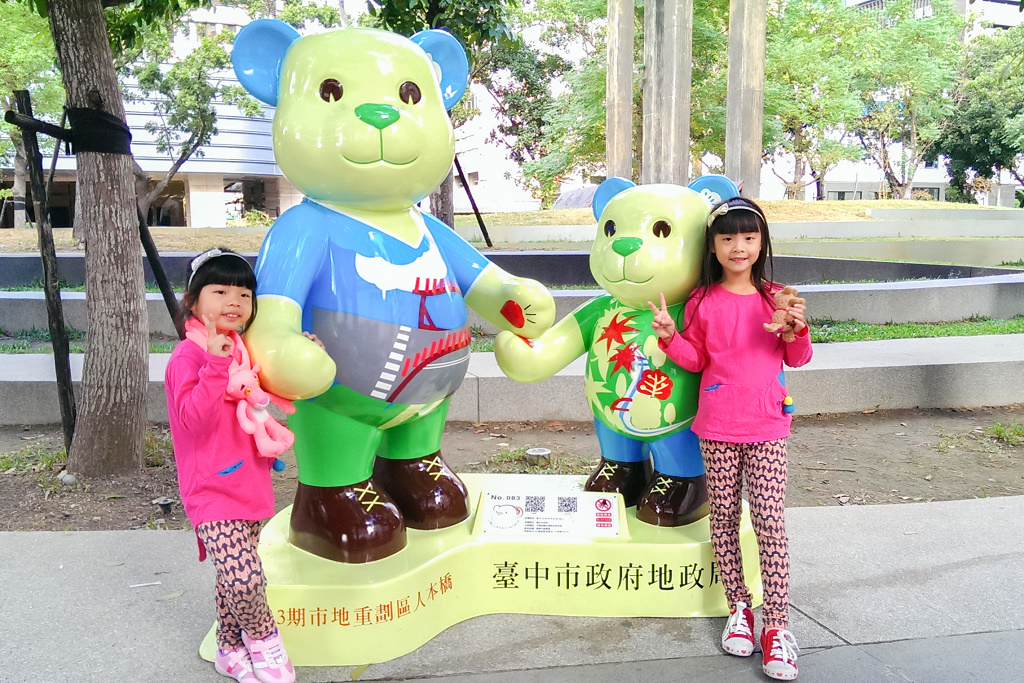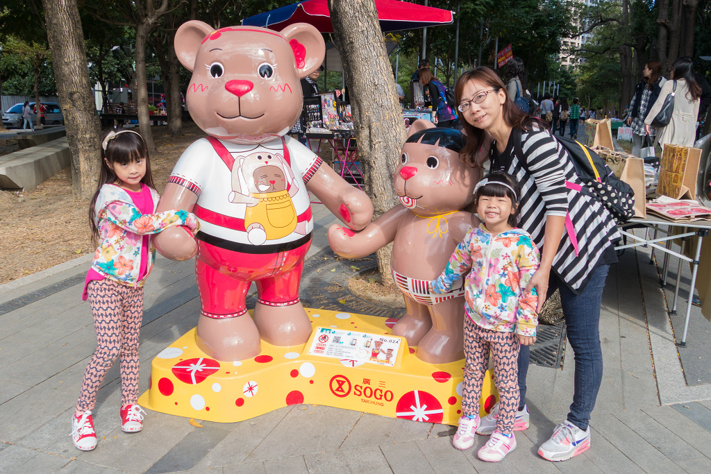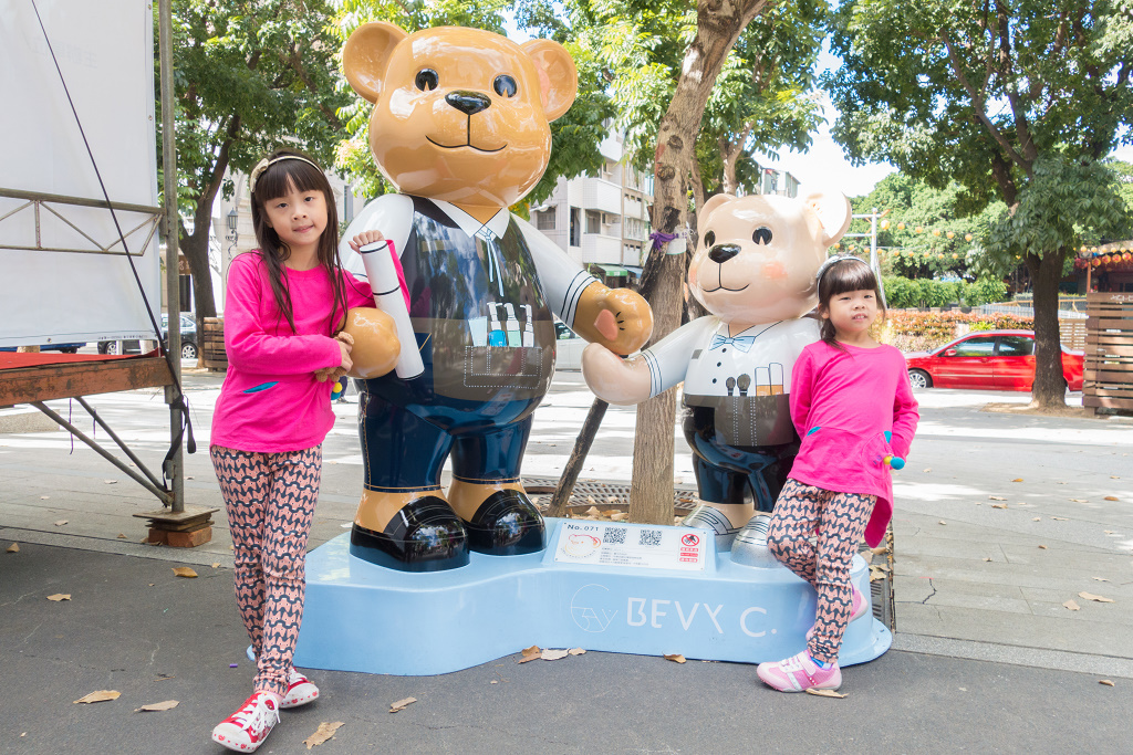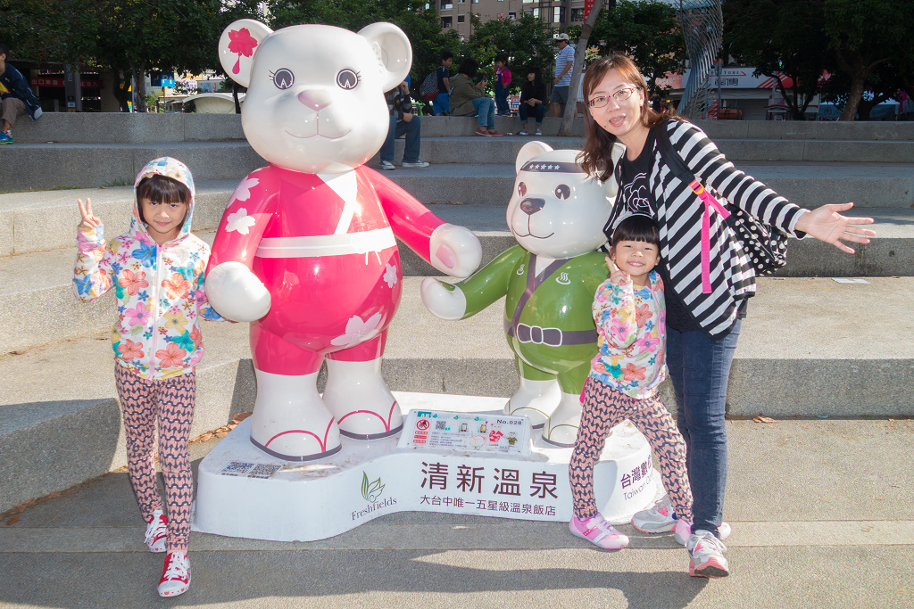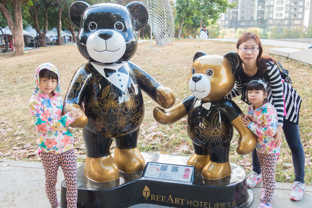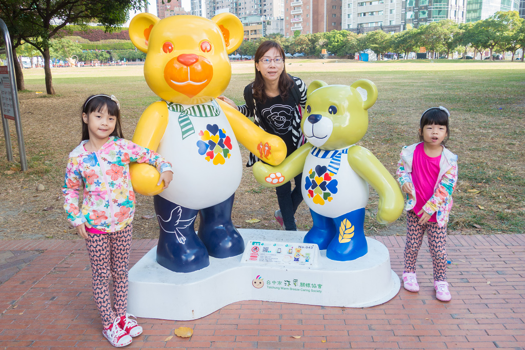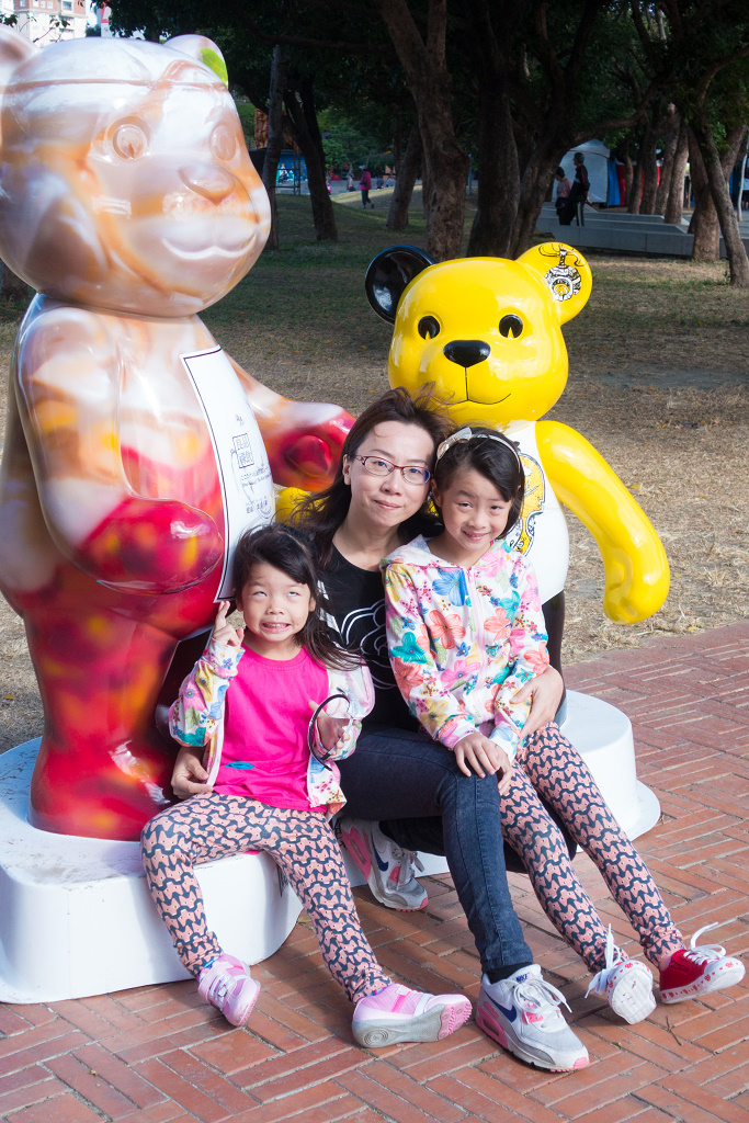 這一屆的展覽活動地點分為三個:秋紅谷、草悟道、臺中國家歌劇院。這一天我們帶小朋友來的是草悟道(市民廣場周邊區域),同時我們也發現今年的泰迪熊與去年不同,每一座都是以「親子熊」的形態呈現,非常溫馨。