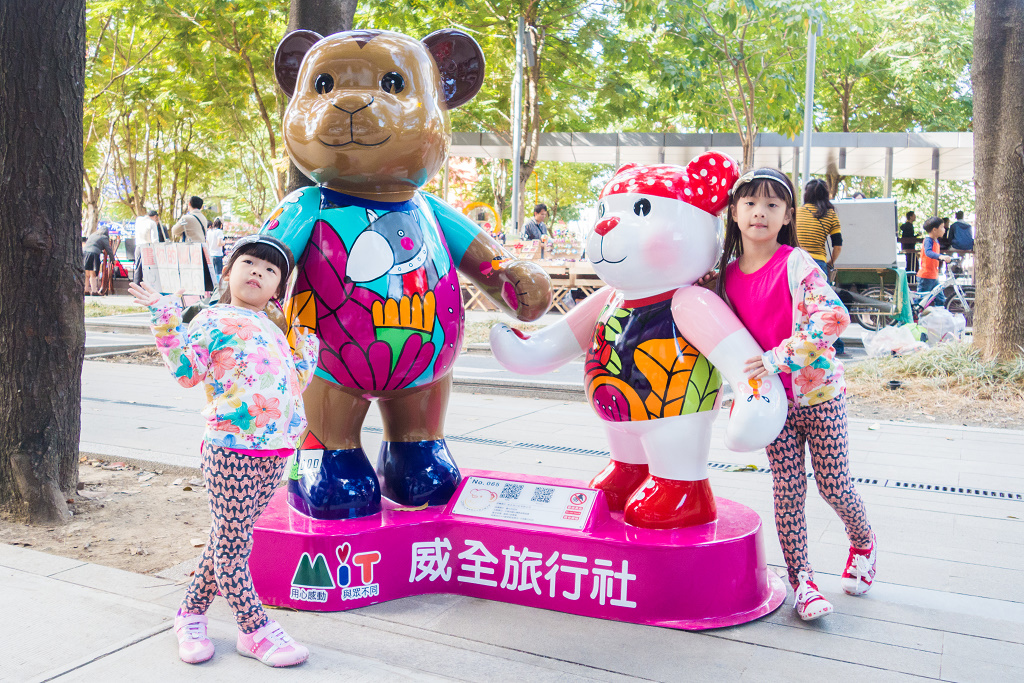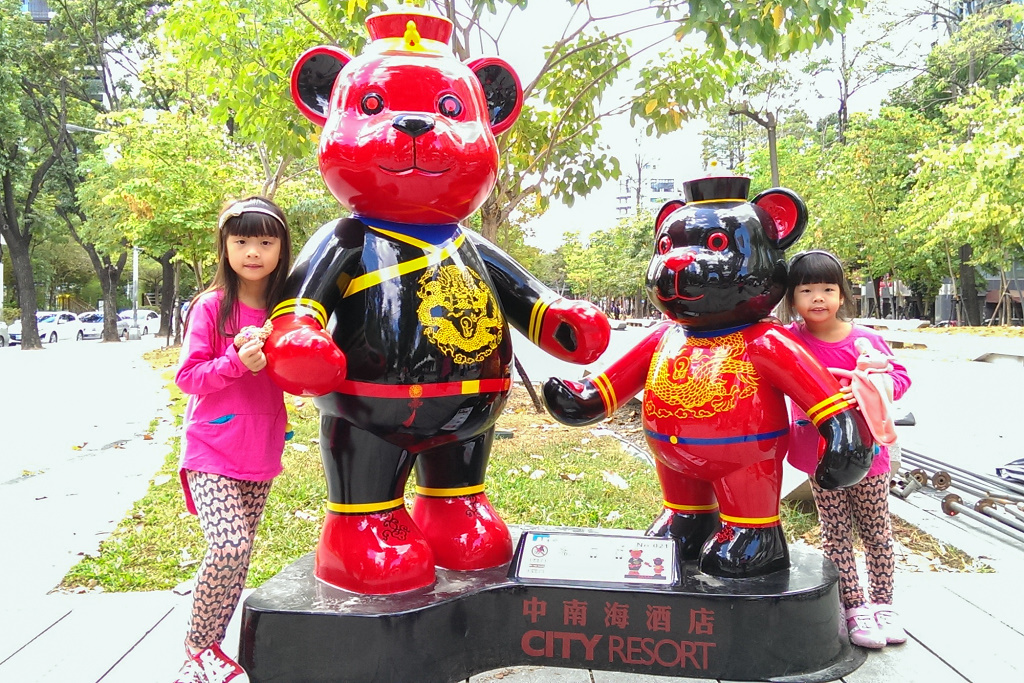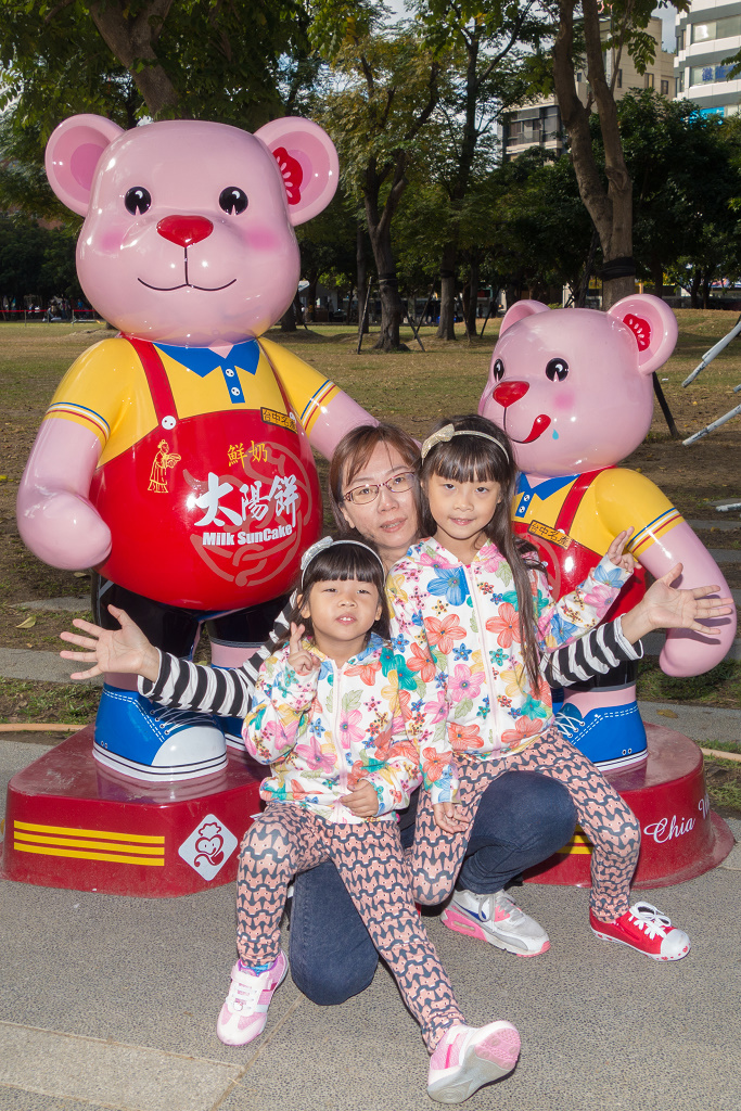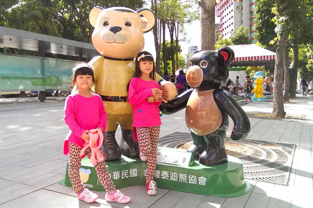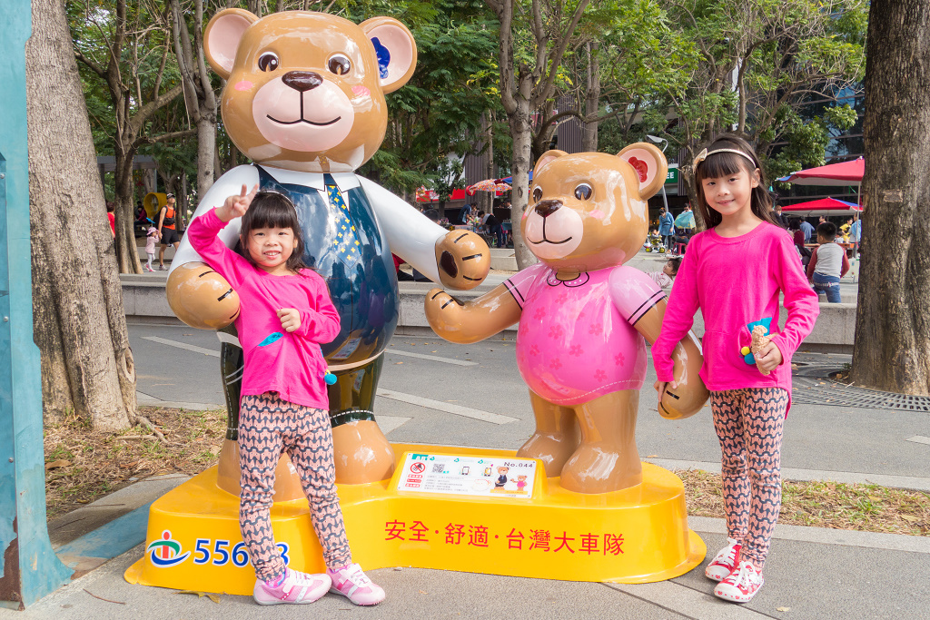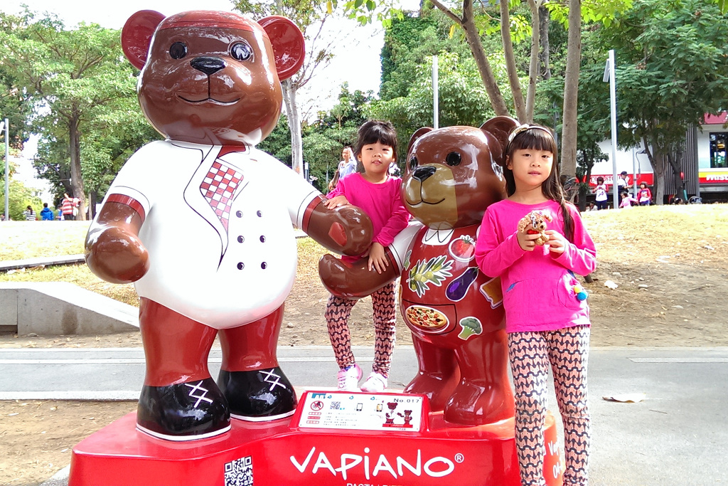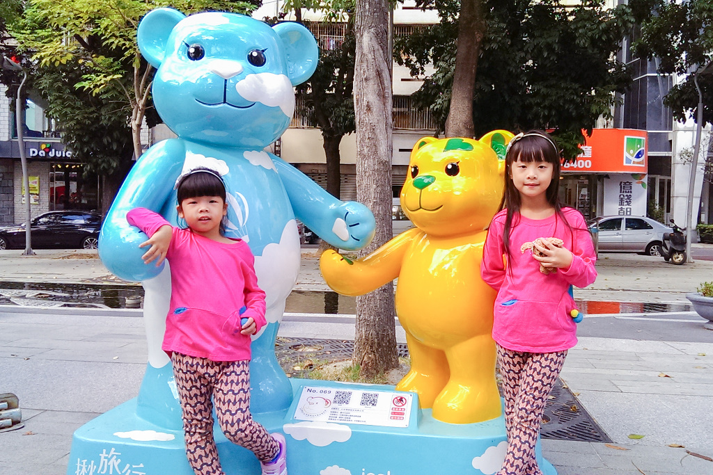 這一屆的展覽活動地點分為三個:秋紅谷、草悟道、臺中國家歌劇院。這一天我們帶小朋友來的是草悟道(市民廣場周邊區域),同時我們也發現今年的泰迪熊與去年不同,每一座都是以「親子熊」的形態呈現,非常溫馨。