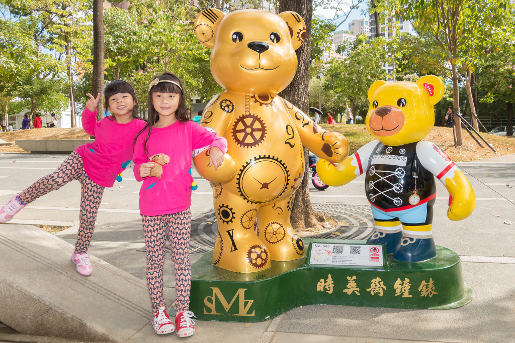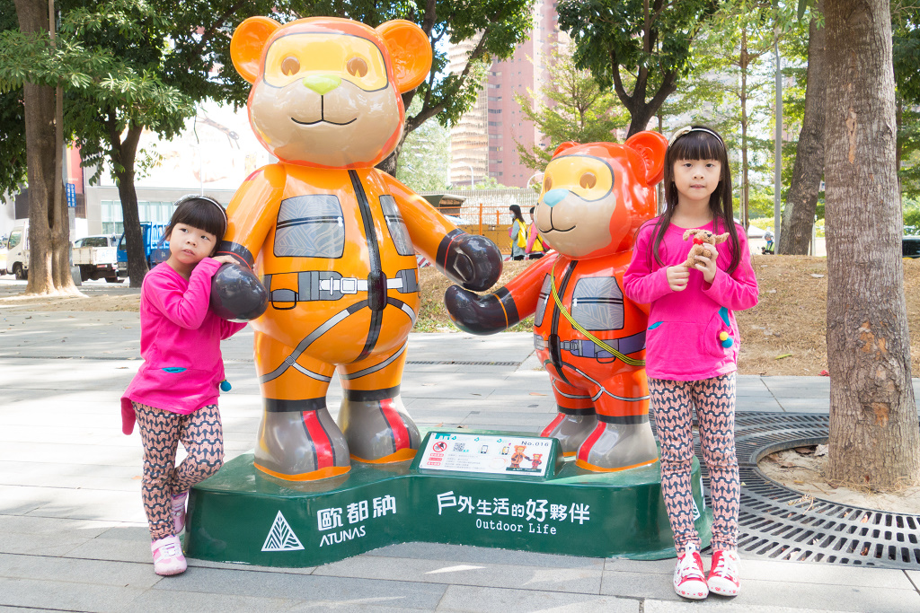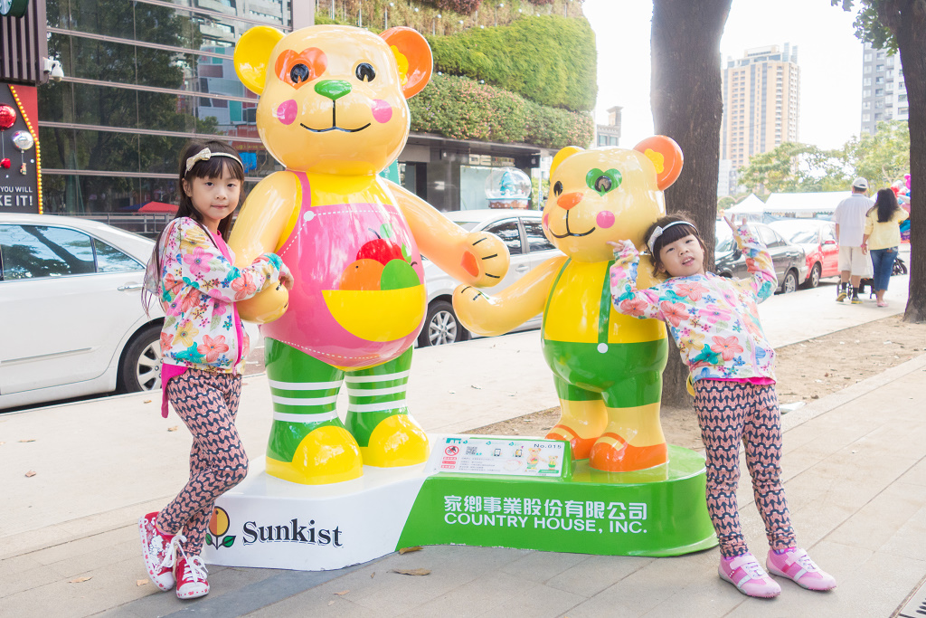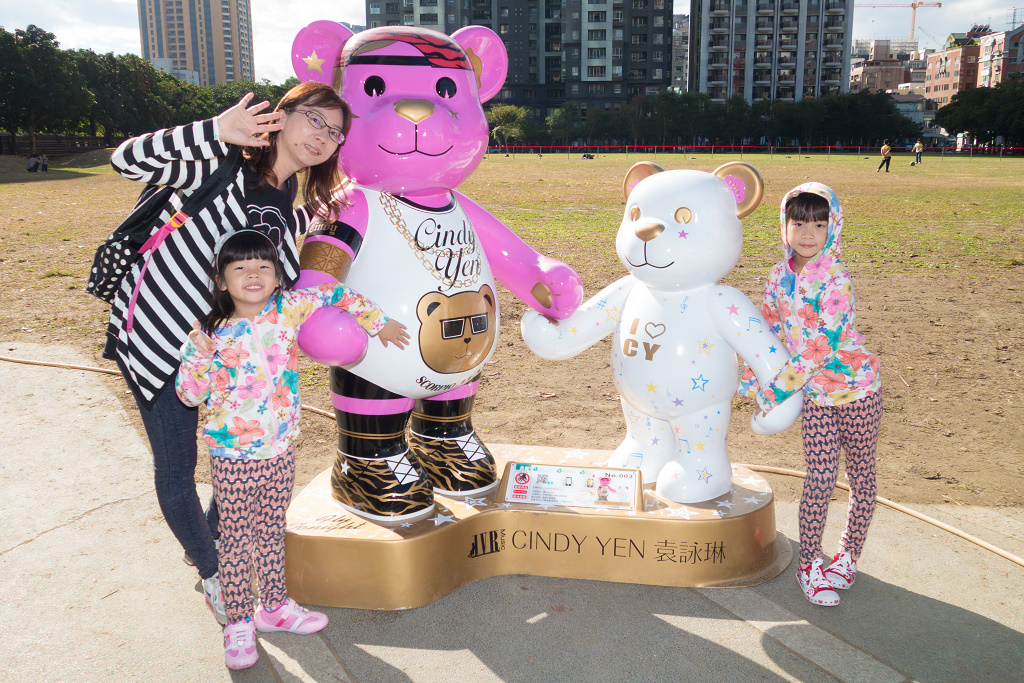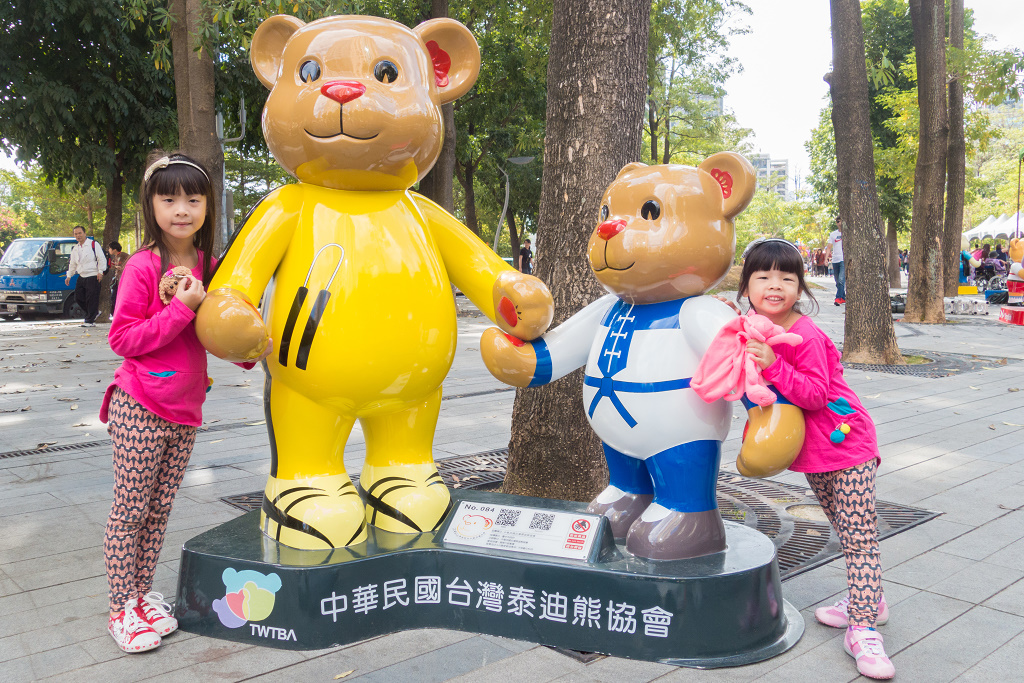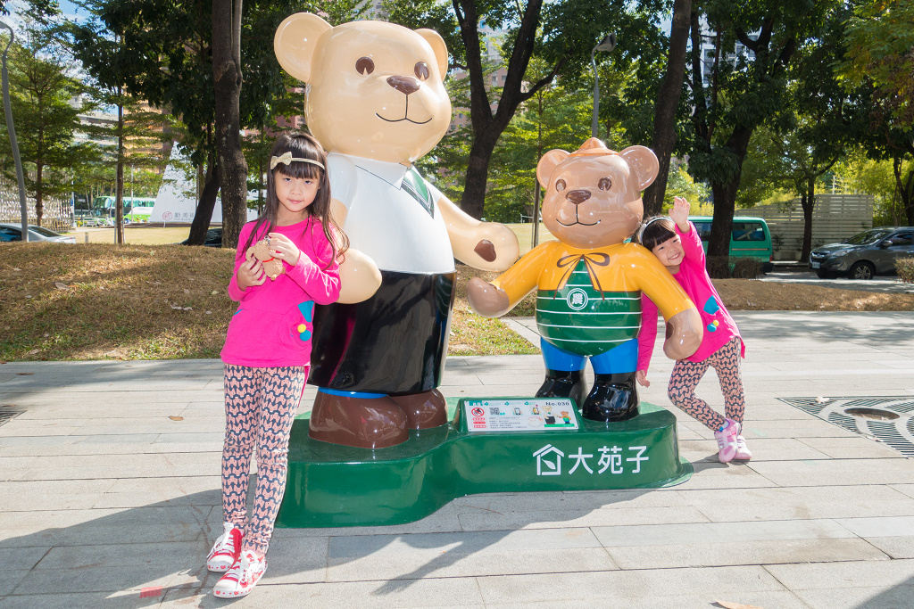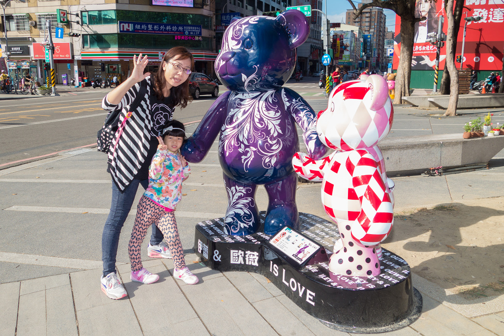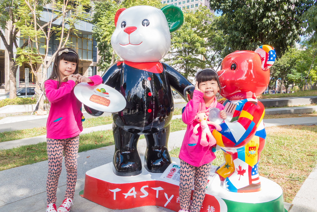 這一屆的展覽活動地點分為三個:秋紅谷、草悟道、臺中國家歌劇院。這一天我們帶小朋友來的是草悟道(市民廣場周邊區域),同時我們也發現今年的泰迪熊與去年不同,每一座都是以「親子熊」的形態呈現,非常溫馨。