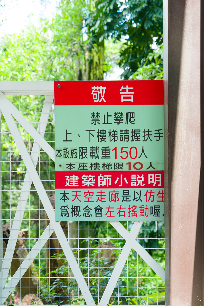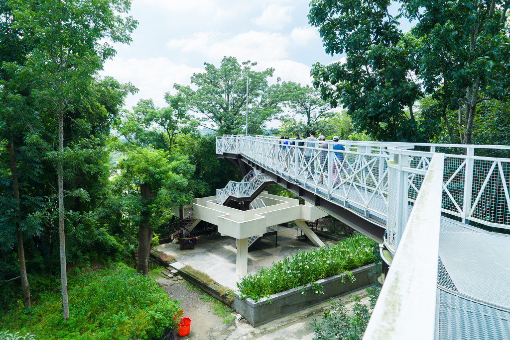 #24 天空走廊係由詹益源建築師事務所設計,為公園重要「遊憩設施」,強調與山林生態融合,形體以仿生概念出發,結構支撐仿樹幹,欄杆仿樹枝,鋪面仿會呼吸的蜘蛛網(減少對環境之衝擊),讓天空走廊以自然溫柔的姿態搭載遊客穿梭於綠野山林之間。該走廊長185公尺,串聯森林區及萬竹博覽園區,離地最高達19公尺(約5層樓高),行走其上穿梭於樹冠枝葉間。可近距離聆聽蟲鳴鳥叫,是最佳戶外生態教室。