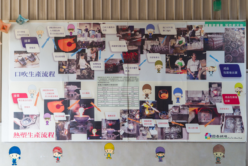 「國泰玻璃」為歷經三代,傳承六十年的空心玻璃窯燒製作業者。早期以生產花瓶、燈罩、生活器皿等玻璃製品為主,於2009年7月開放窯燒廠區,並轉型為觀光工廠。工廠分成模具區、退火爐、原料區、展覽室、販售區、展示區、遊客休憩區、手工表演區、口吹表演區和DIY教學區,讓遊客得以一窺工藝玻璃產業的奧秘。