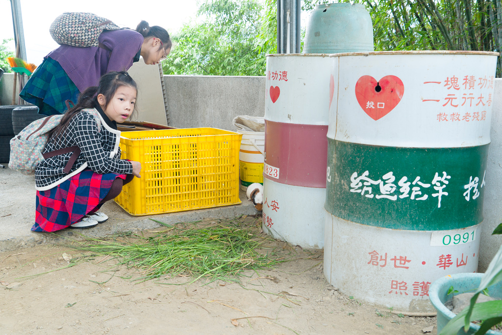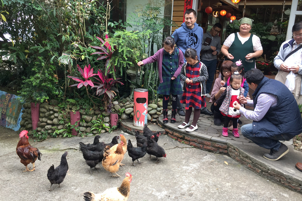 原來是叫農場養的雞來吃飯,還會發饅頭給小朋友幫忙餵,畫面很有趣~