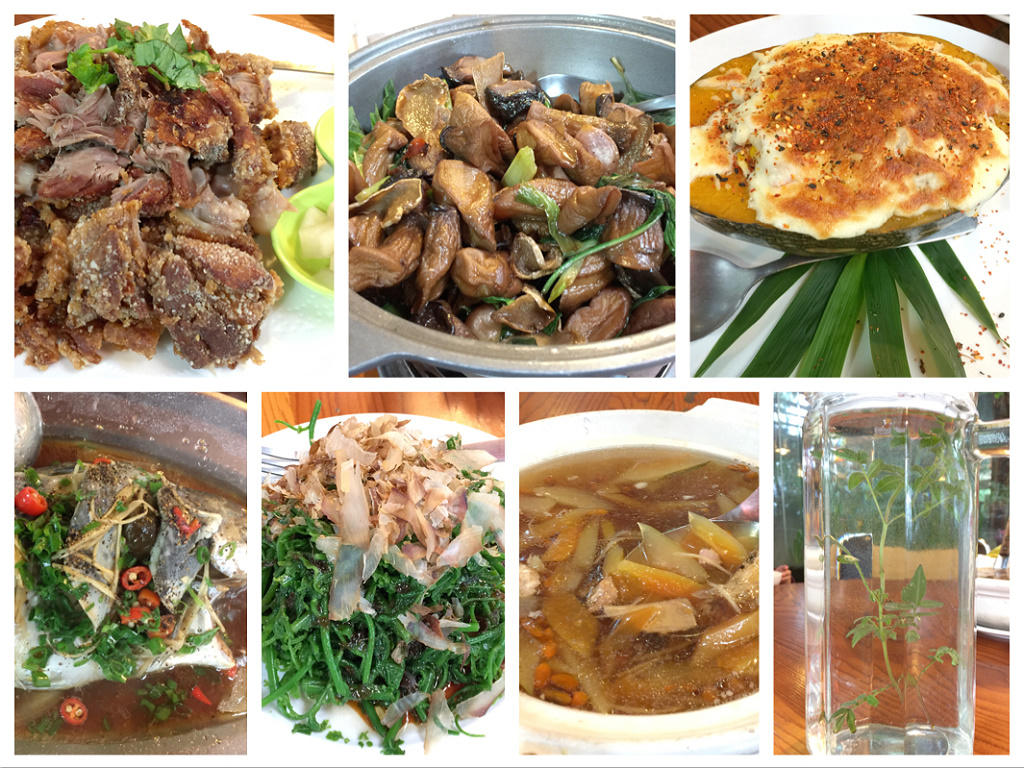 #92 我們家點的是6人合菜(德國豬腳佐醃蘿蔔、三杯杏鮑菇、焗烤海鮮南瓜、清蒸紫蘇梅魚、梅味山蕨、藥膳燉湯),隨餐都有的是農場自己種的芳香萬壽菊茶,看起來沒什麼顏色,其實味道很香,而且還有很明顯的百香果香氣,兩個小朋友一喝都大叫「百香果」!