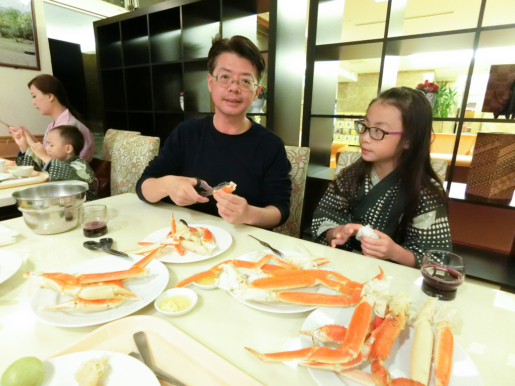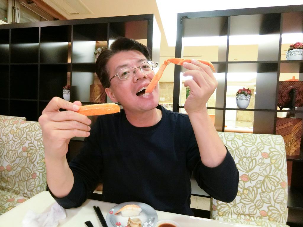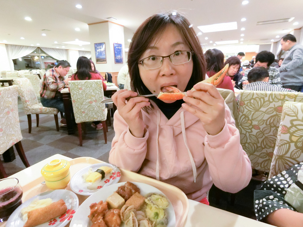 #112 還好豐富的自助式晚餐安撫了我們弱小的心靈,有廚師現烤牛排、蟹肉味噌湯、旋轉壽司、牛肉壽喜燒等等美食,菜色非常多!當然最重要的是......