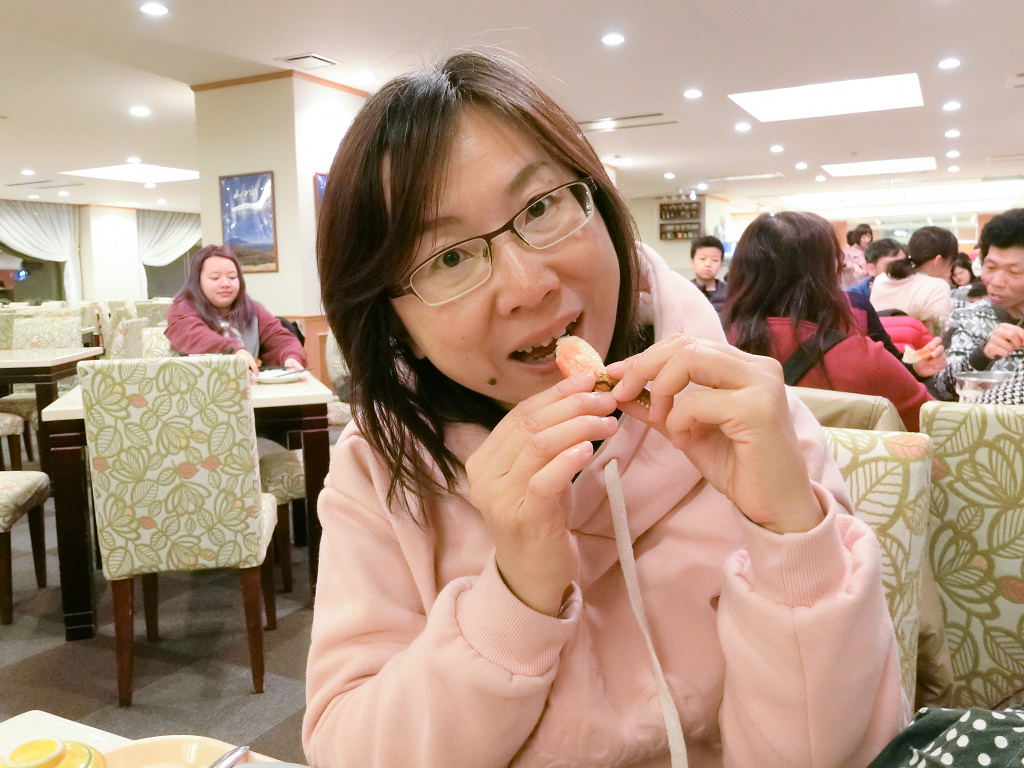 我們笨拙(錯誤)又缺乏效率的動作讓一旁的餐廳服務人員(一位日本大嬸)看不下去,直接走過來制止我的動作,然後默默拿起剪刀示範給我們看,什麼才是「大師級」的專業吃蟹技巧...「剪刀關節技」!!!