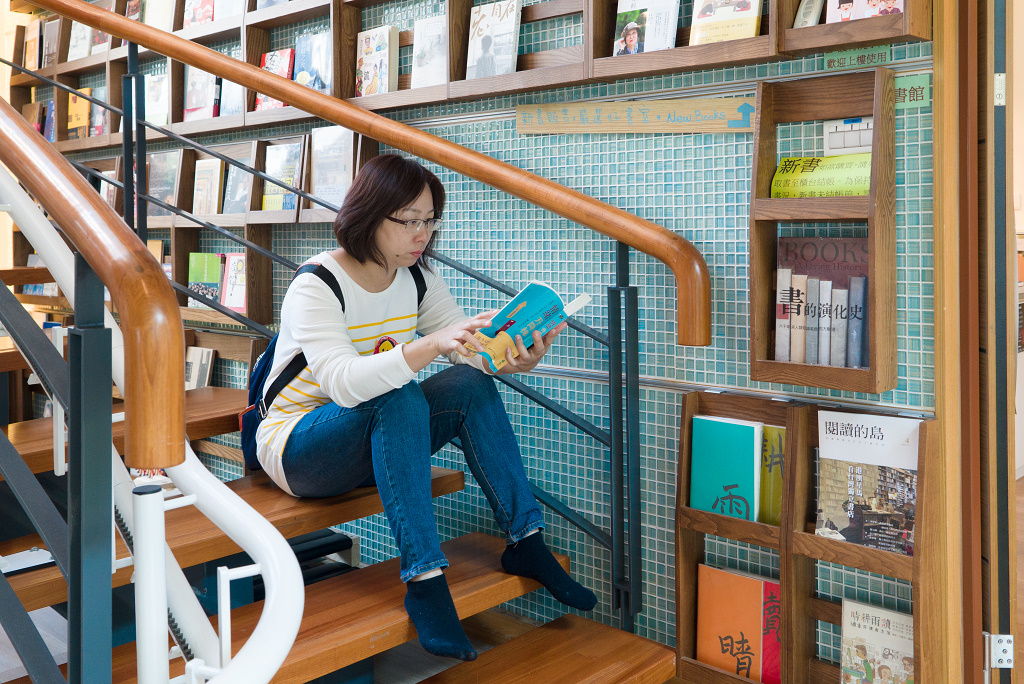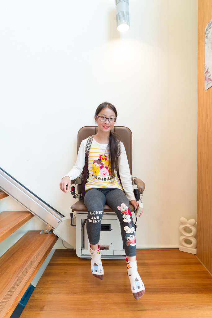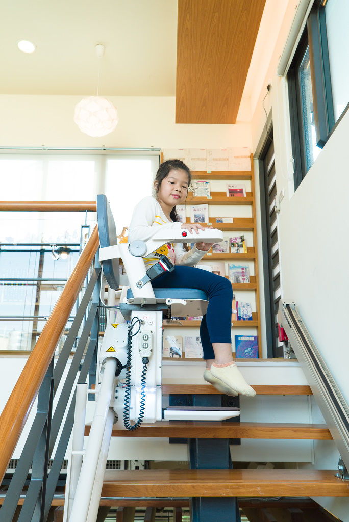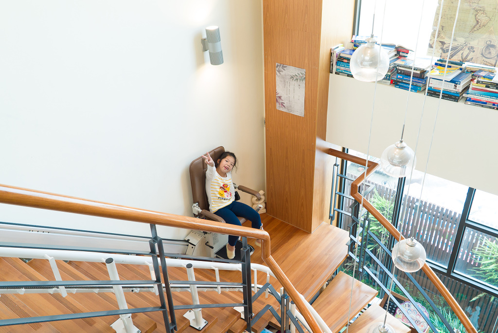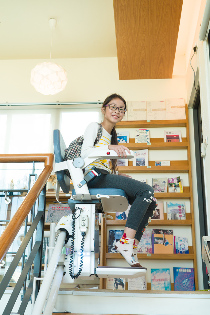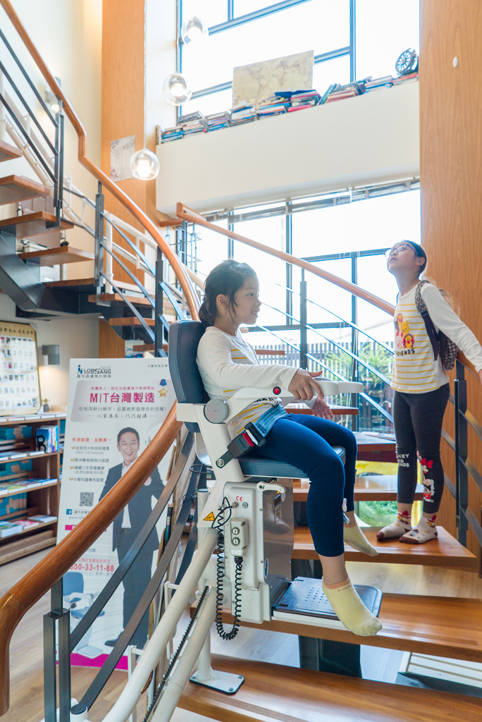 #23 結果小朋友第一個看到的不是書,是...「樓梯升降椅」,剛好我們家是最早進來的,還沒有其他遊客,所以工作人員特別幫我們介紹這個設施,還讓小朋友們體驗升降椅。