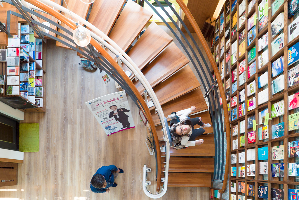 #25 升降椅、螺旋梯、大書牆,構成了一個有趣的畫面。