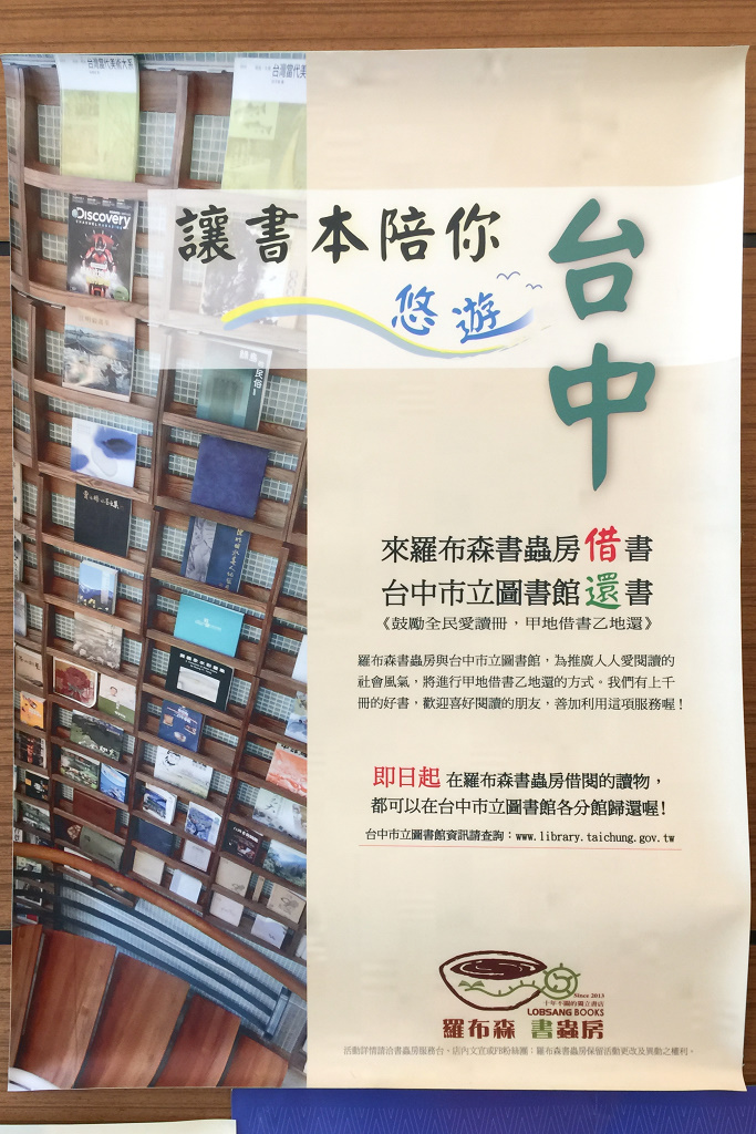 #56 自105年8月起,在台中市立圖書館的大力支持下,讀友們在羅布森書蟲房借閱的書籍也可以透過台中市立圖書館各分館歸還,大大增加了閱讀的便利性。
