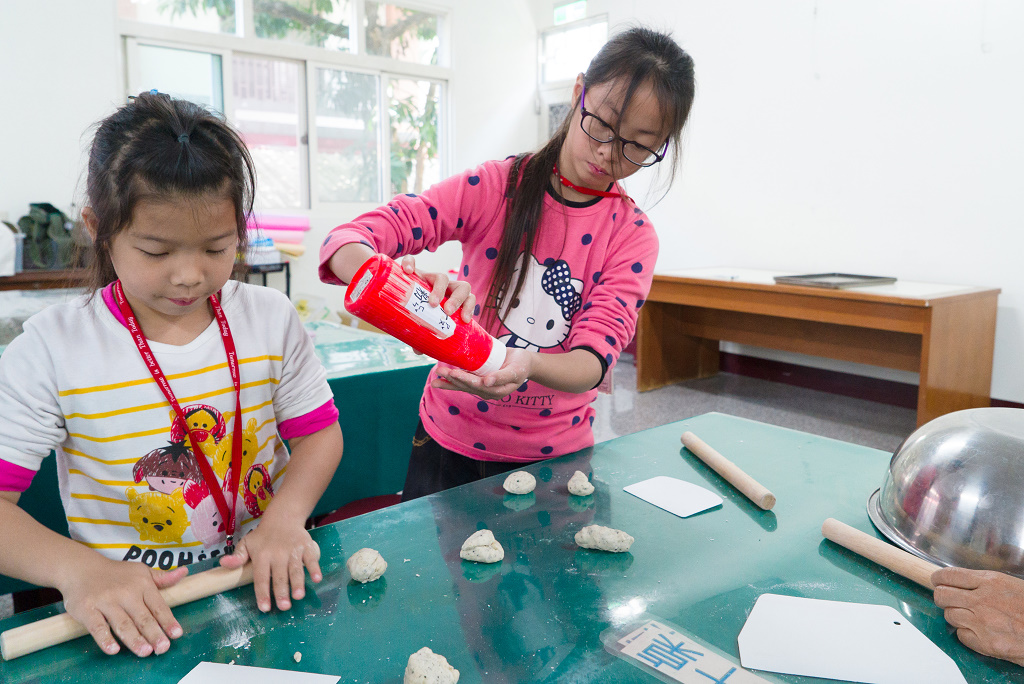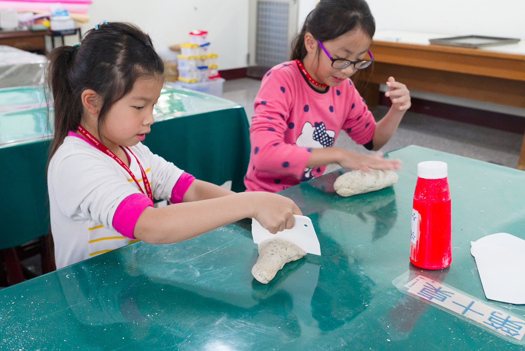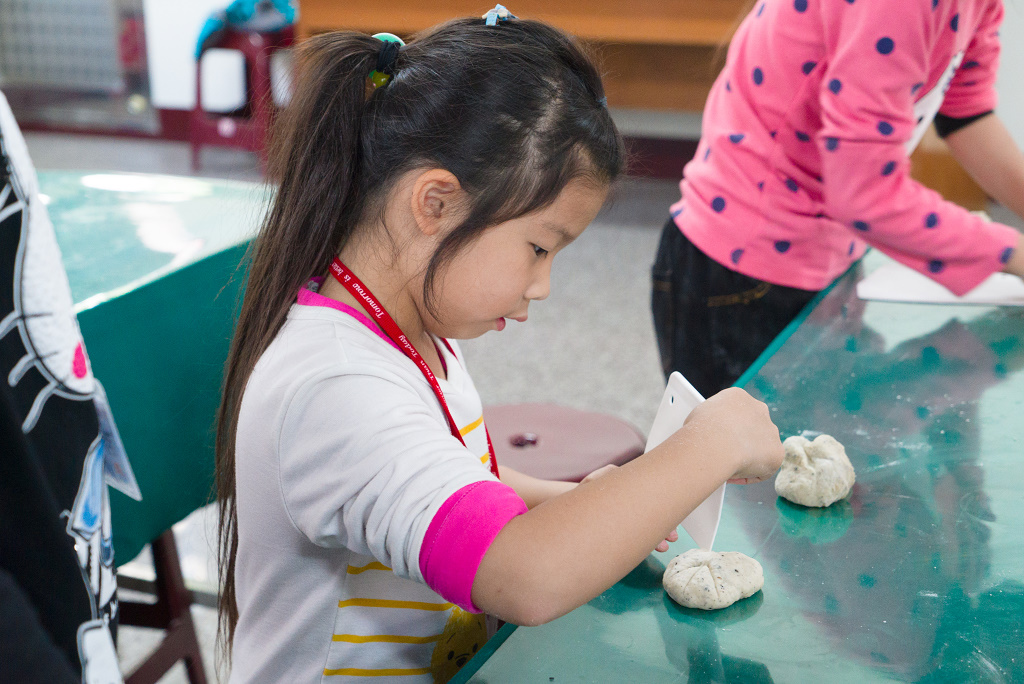 #50 妹妹在麵包畫上紋路。