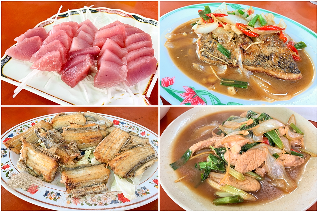 #51 鮪魚生魚片、紅燒鬼頭刀、椒鹽白帶魚、鮮炒旗魚蛋
