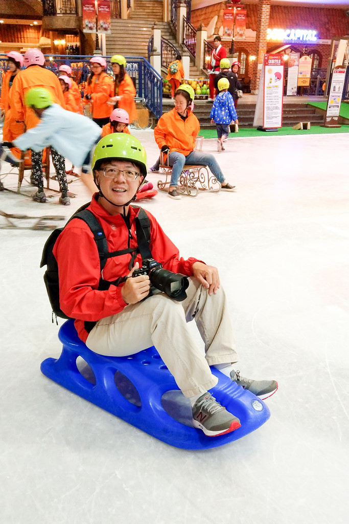 #44 各種特殊造型雪橇任君挑選,開始玩囉!(旅行社會發給每人一雙手套、一件橘色防風衣,其實防風衣不太需要穿,因為裡頭沒有想像中的冷,而且大多數人認為衣服顏色很像工作服...XD)