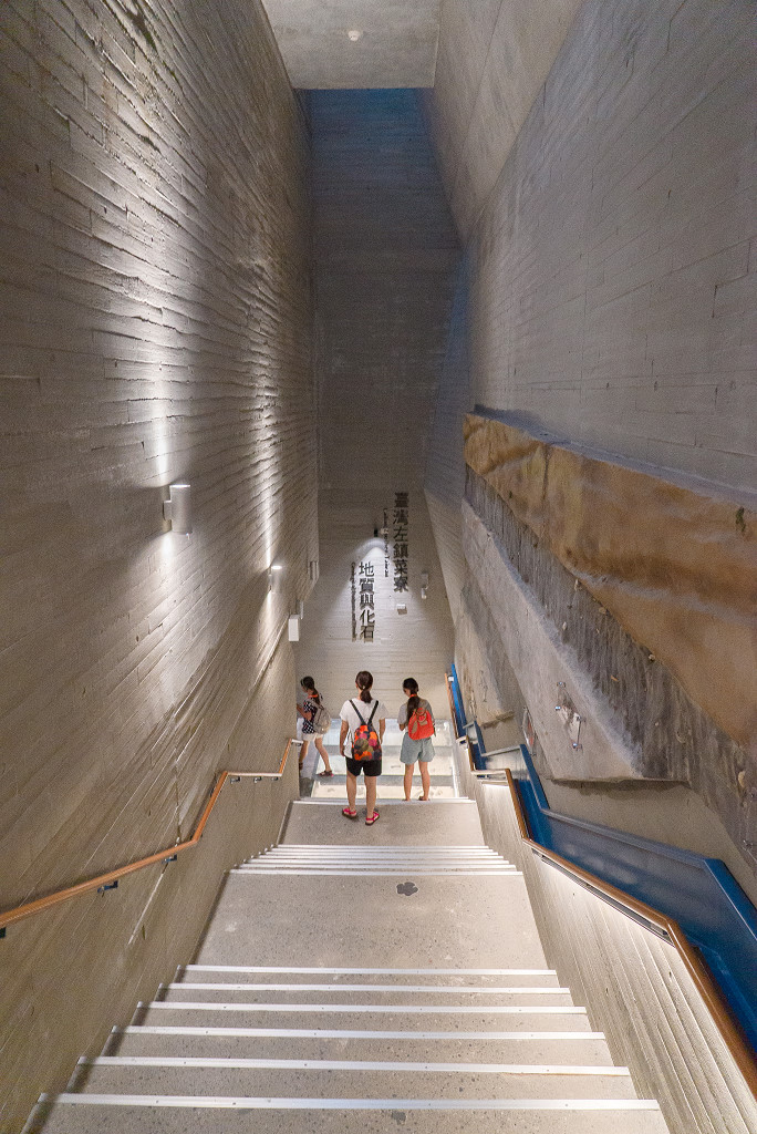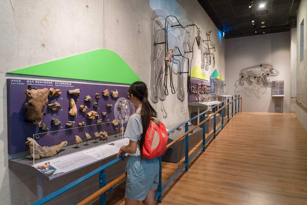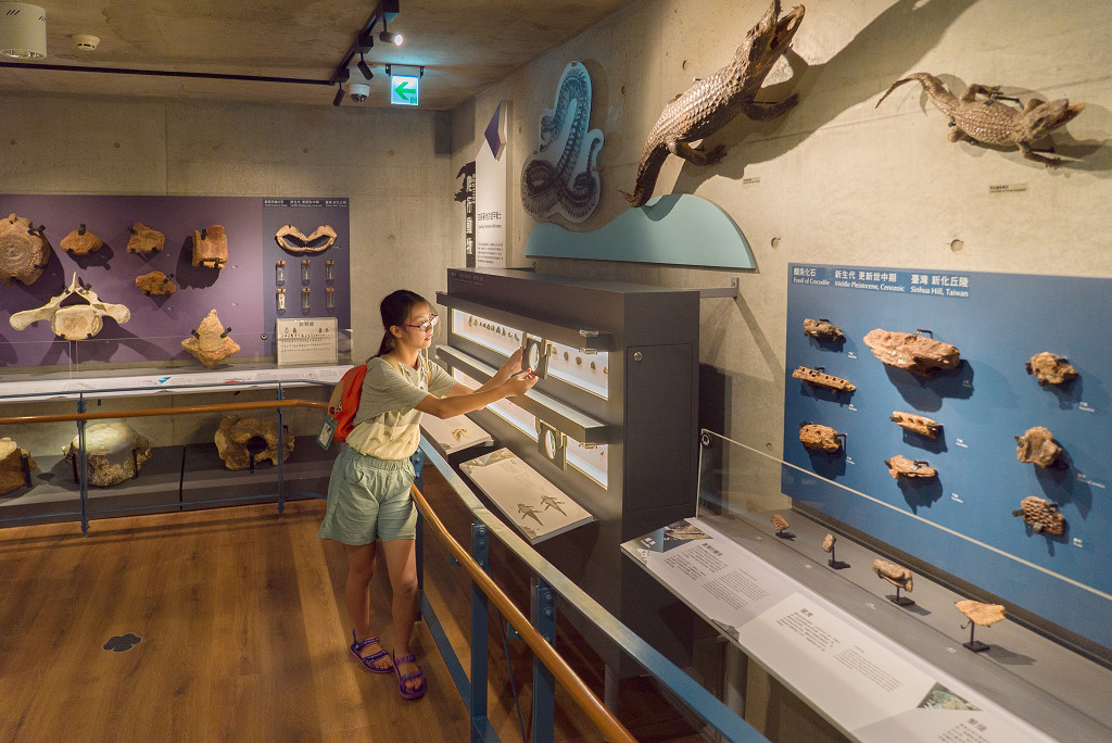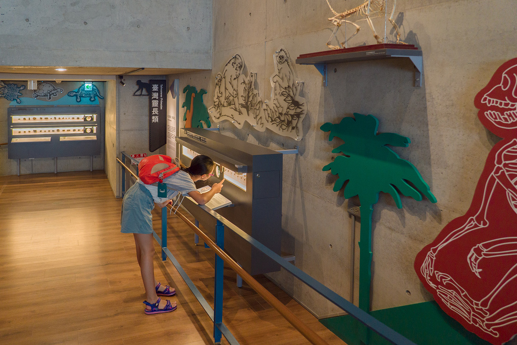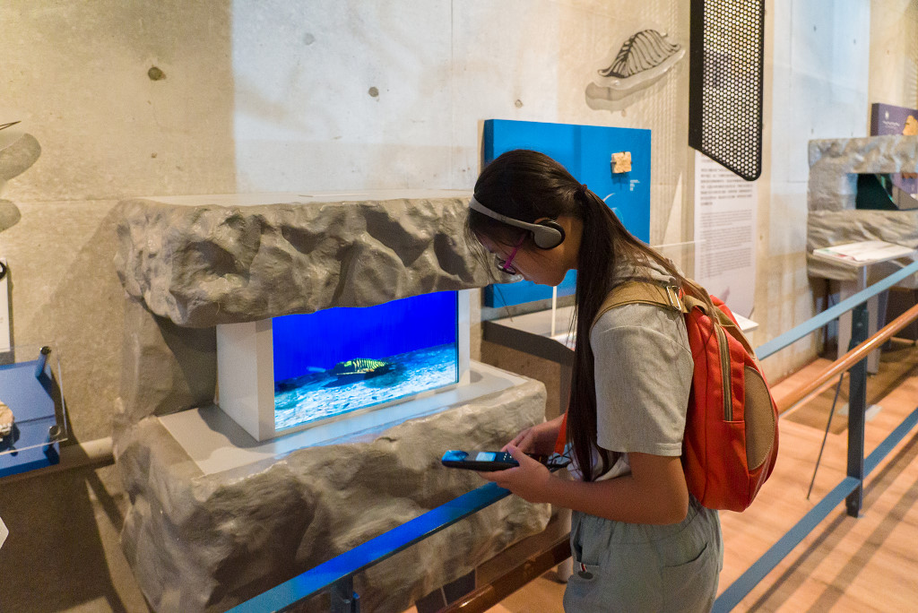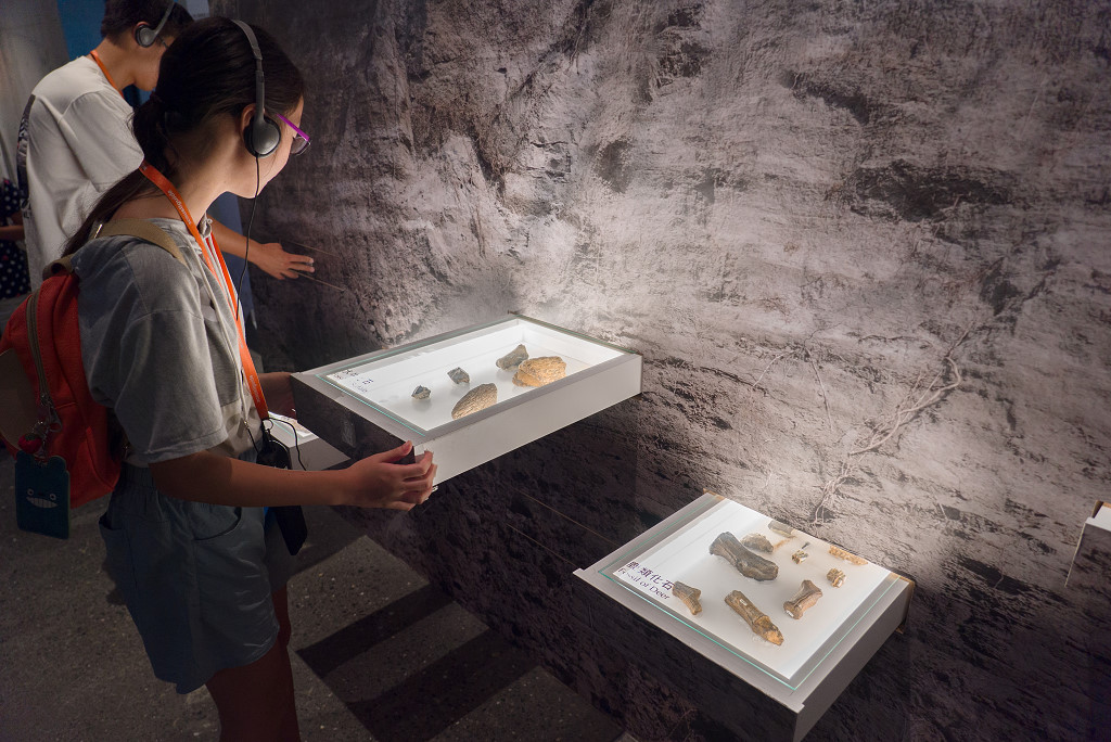 #5 我們在服務台借了2台個人語音導覽機,進入第一館:自然史教育館,模擬左鎮的地層岩壁,在這裡能體驗多元互動裝置,如化石挖掘、河床化石觀察。