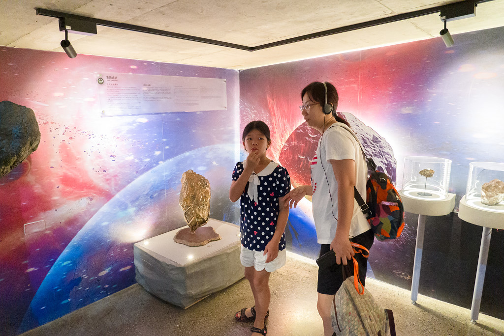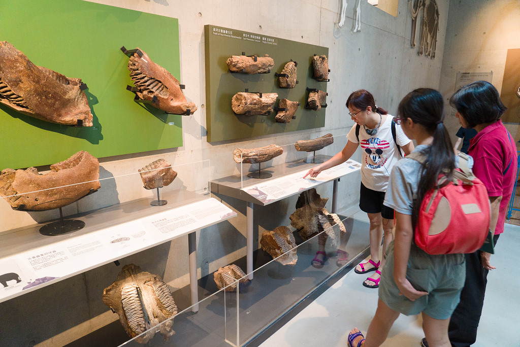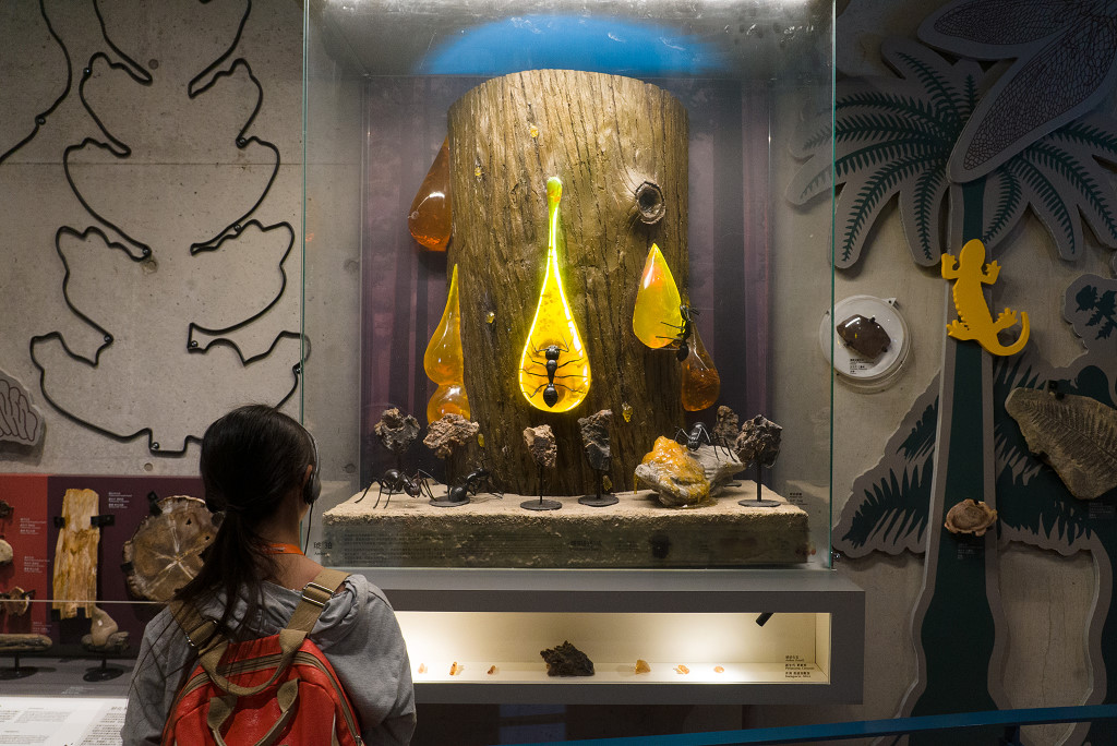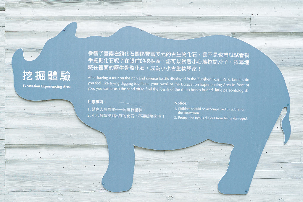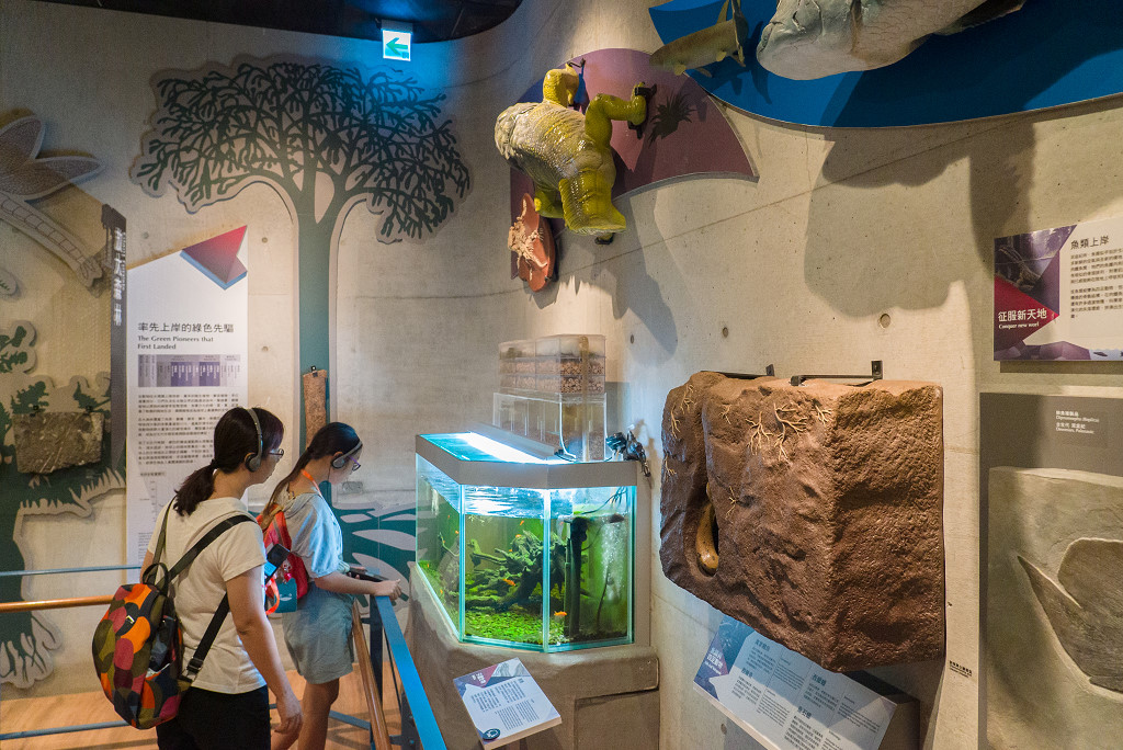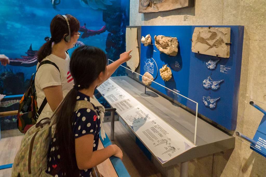 #5 我們在服務台借了2台個人語音導覽機,進入第一館:自然史教育館,模擬左鎮的地層岩壁,在這裡能體驗多元互動裝置,如化石挖掘、河床化石觀察。