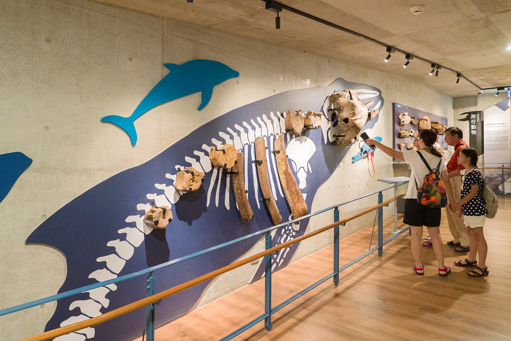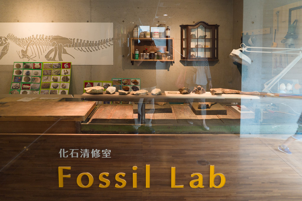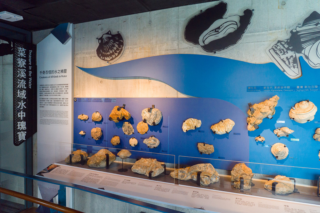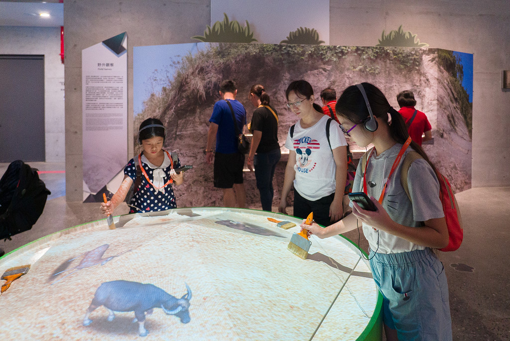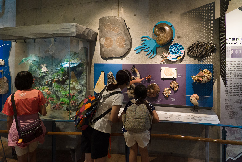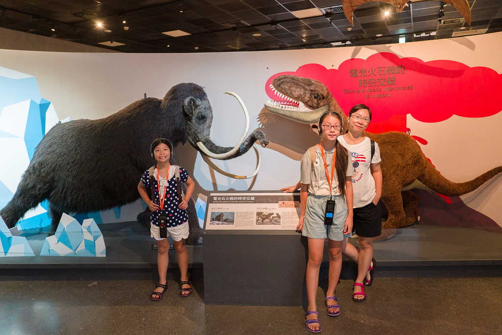 #5 我們在服務台借了2台個人語音導覽機,進入第一館:自然史教育館,模擬左鎮的地層岩壁,在這裡能體驗多元互動裝置,如化石挖掘、河床化石觀察。