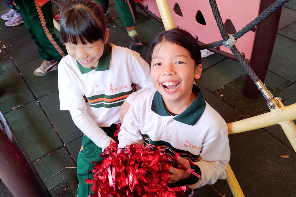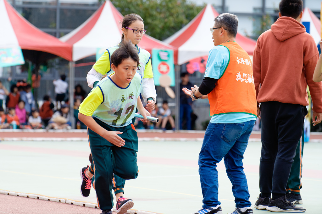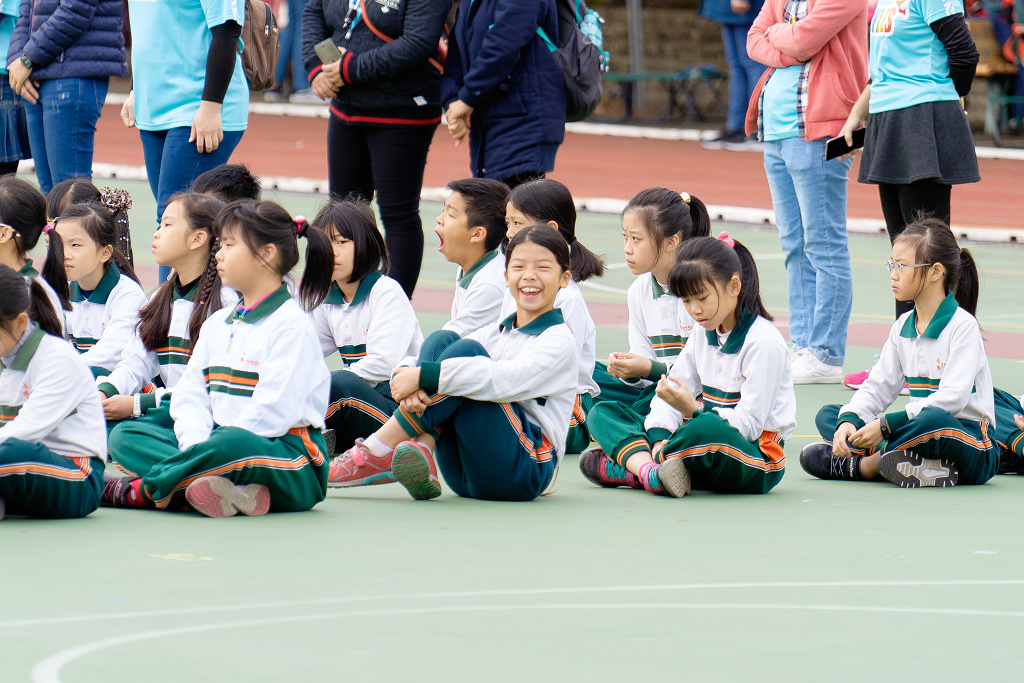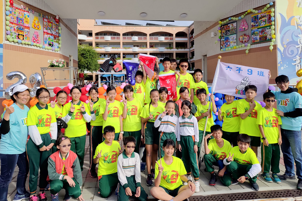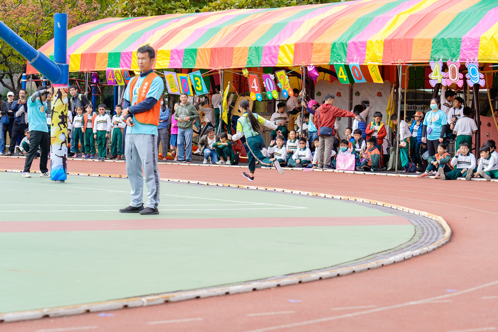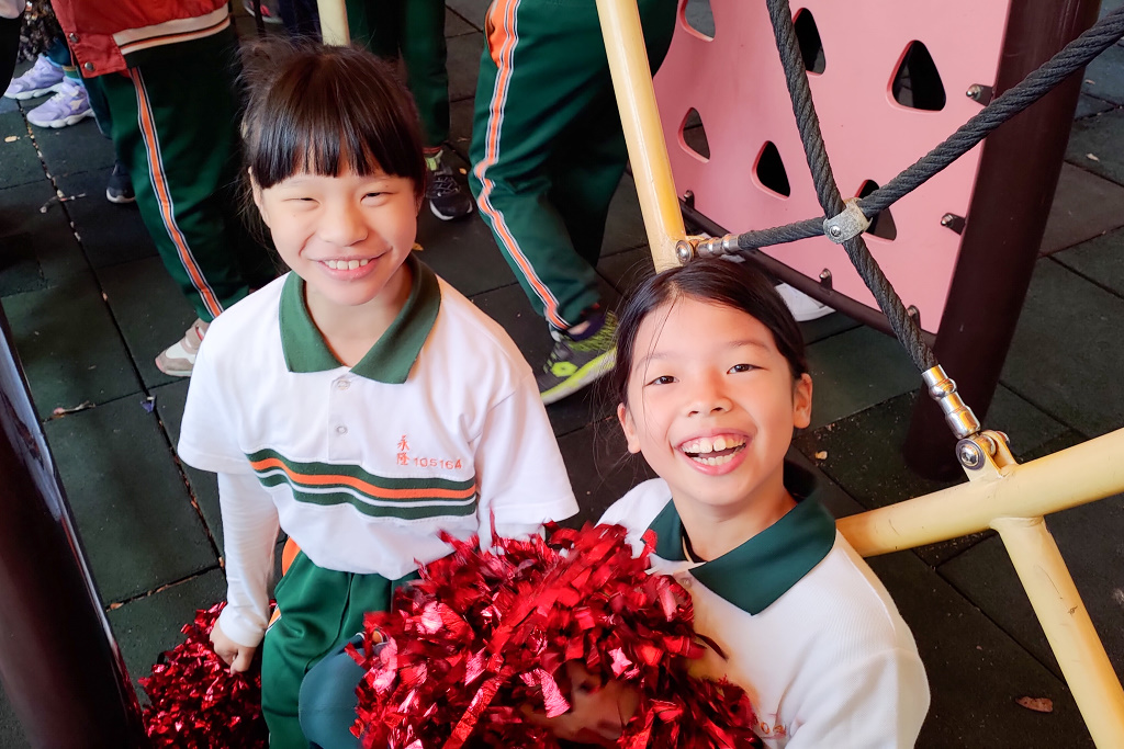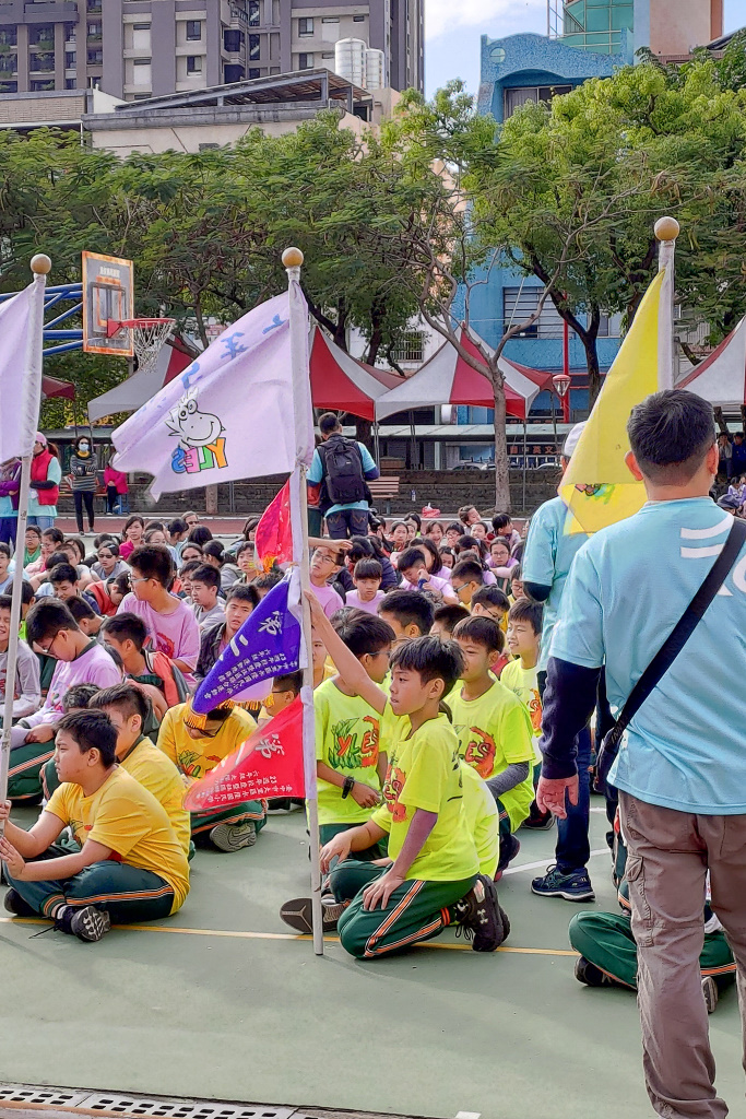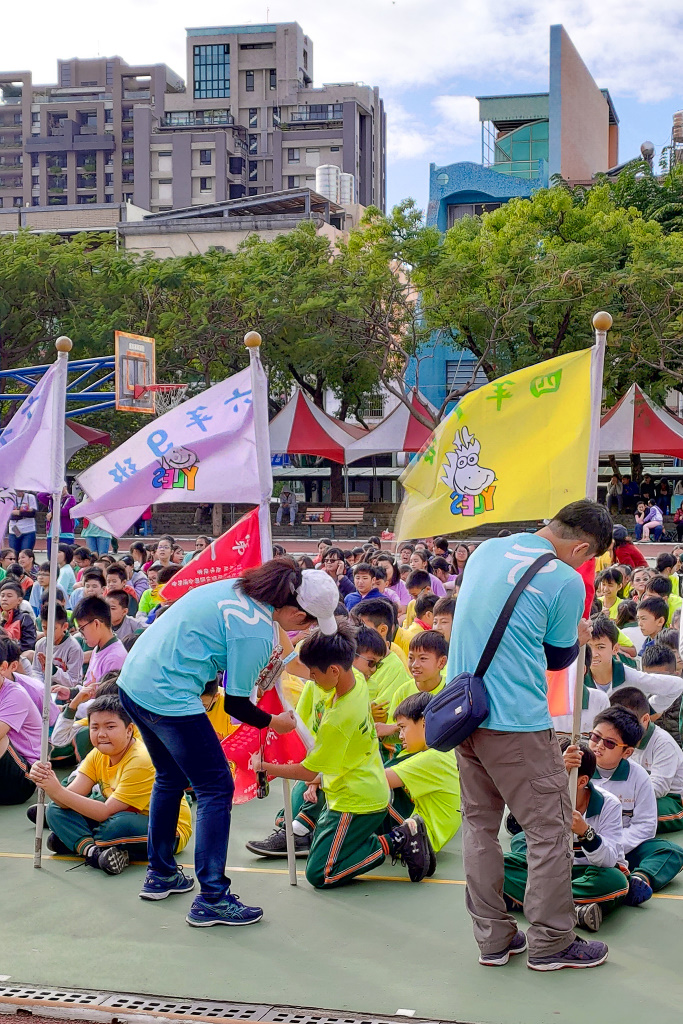 #41 林家姊姊的班級獲得趣味競賽第一名、大隊接力第一名、運動總錦標第二名,導師興奮地把錦旗綁在班旗上。
