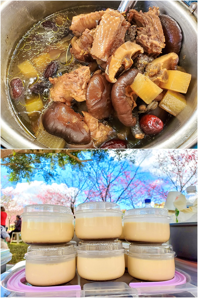 #5 這次野餐餐點豐富,有小美幫忙做的 #巴斯克乳酪蛋糕 #列日鬆餅 #芝麻糖 #黑糖布丁 #歐式乳酪丁麵包 #費太太藍帶巧克力餅干 #滷豆乾,還有滷製了一星期相當入味的 #茶葉蛋 和阿公燉煮的 #老菜脯雞湯、阿嬤準備的 #當季水果
