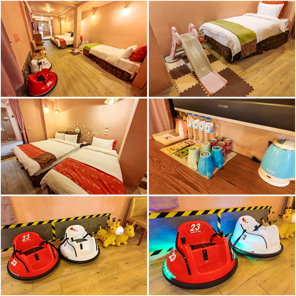 #72 第一晚的「碰碰車房」,1大床+2小床的房型讓人感覺上是所有親子主題房中最大的,有2台碰碰車、溜滑梯、2隻跳跳馬。